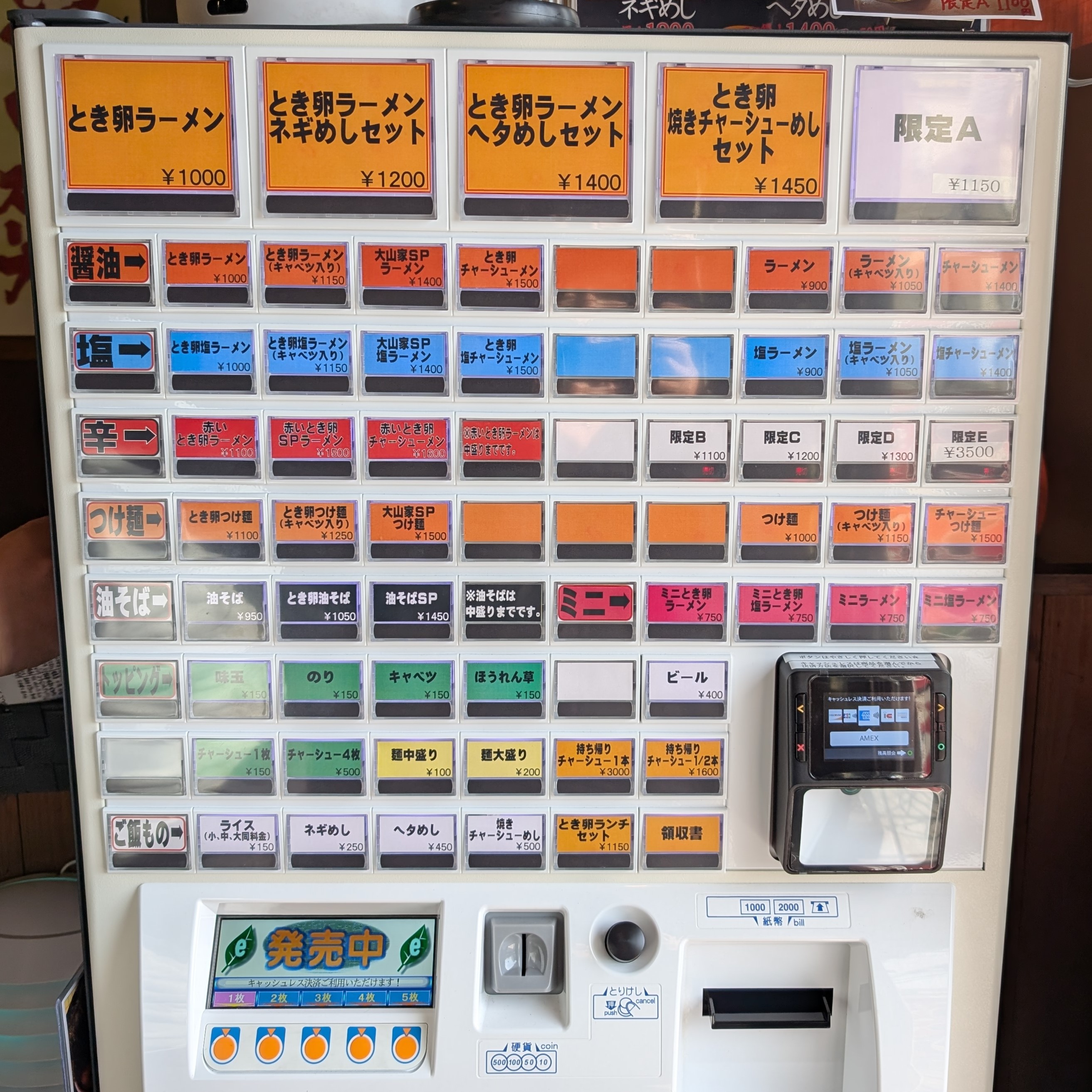 このNew券売機とは初対面。キャッシュレス決済にも対応したハイスペック機に超進化したみたい。タッチパネル式じゃないのもボタン配置を覚えられるので、自分的にはこうゆうやつの方が使い勝手がいい。ただ使える紙幣が「千円札」と「二千円札」だけとな…!? 一応 記念に持ってはいる(レア番ではなくただのピン札)けど、二千円札ってほとんどが沖縄だけで流通してるんじゃなかったっけ? なんかのテレビで見たぞ!? まさかこれ沖縄仕様なのか!?