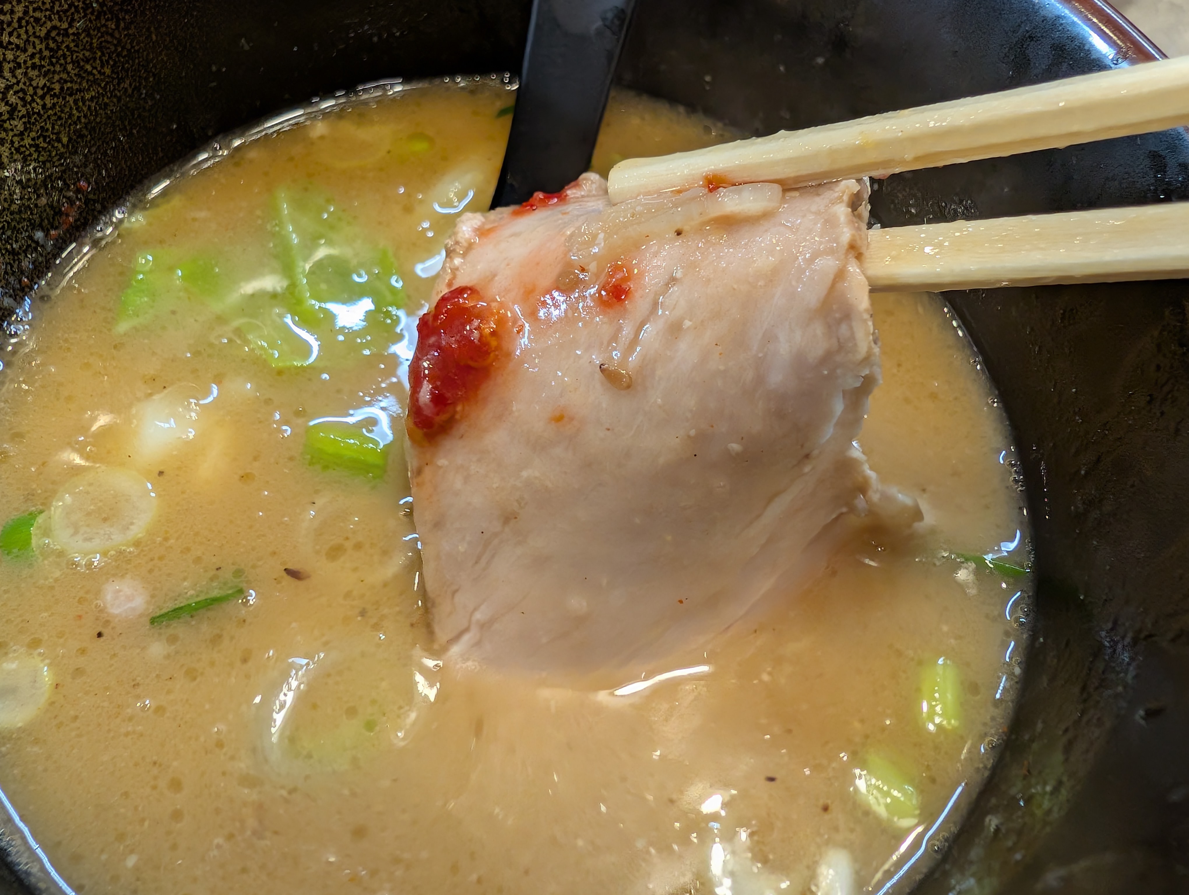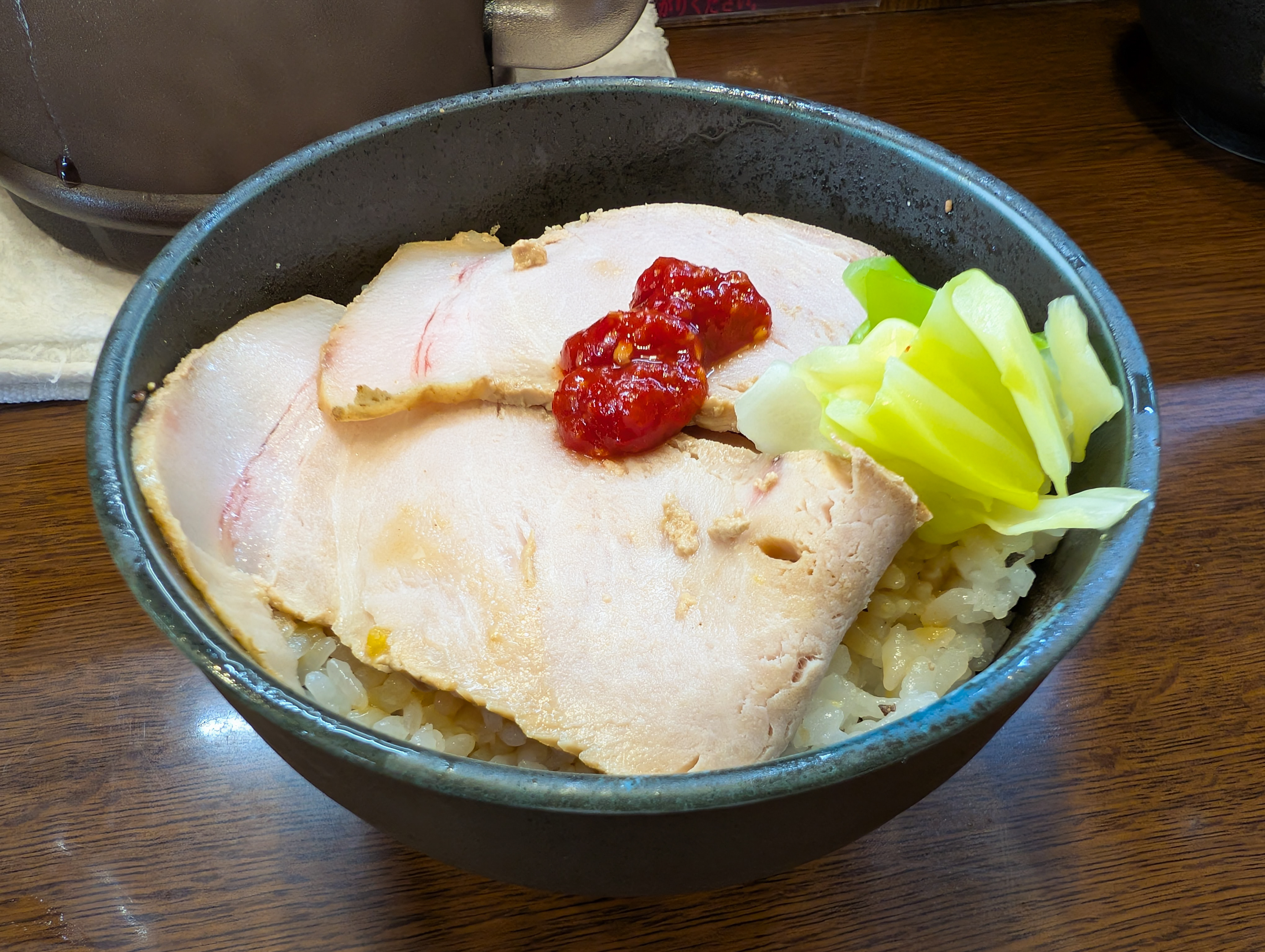 低チャは焼きチャに比べ味が淡白なので、アクセントに豆板醤をチョット乗せたり、スープ割りしたつけ汁に潜らせて「オカズ化」を上げて頂いた。はい、うまい!
