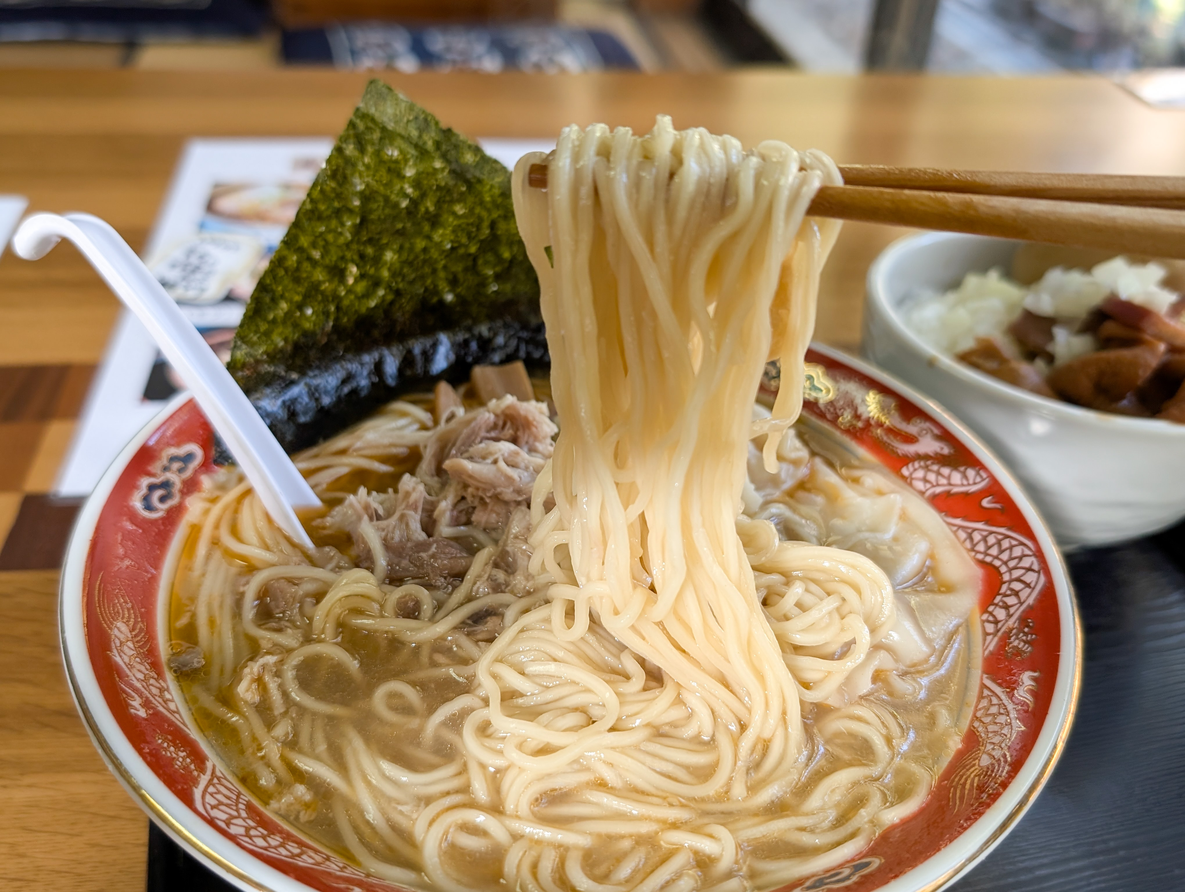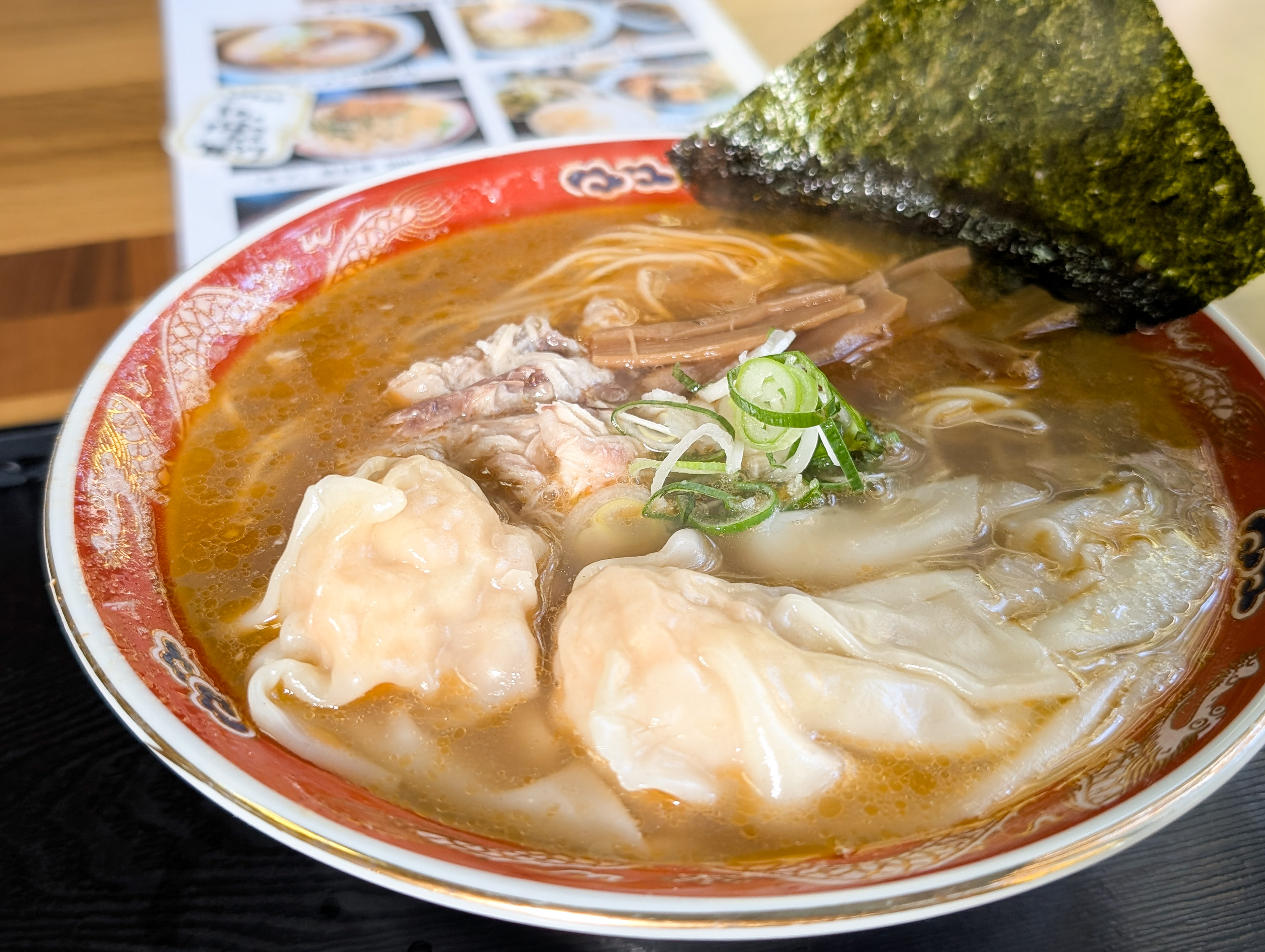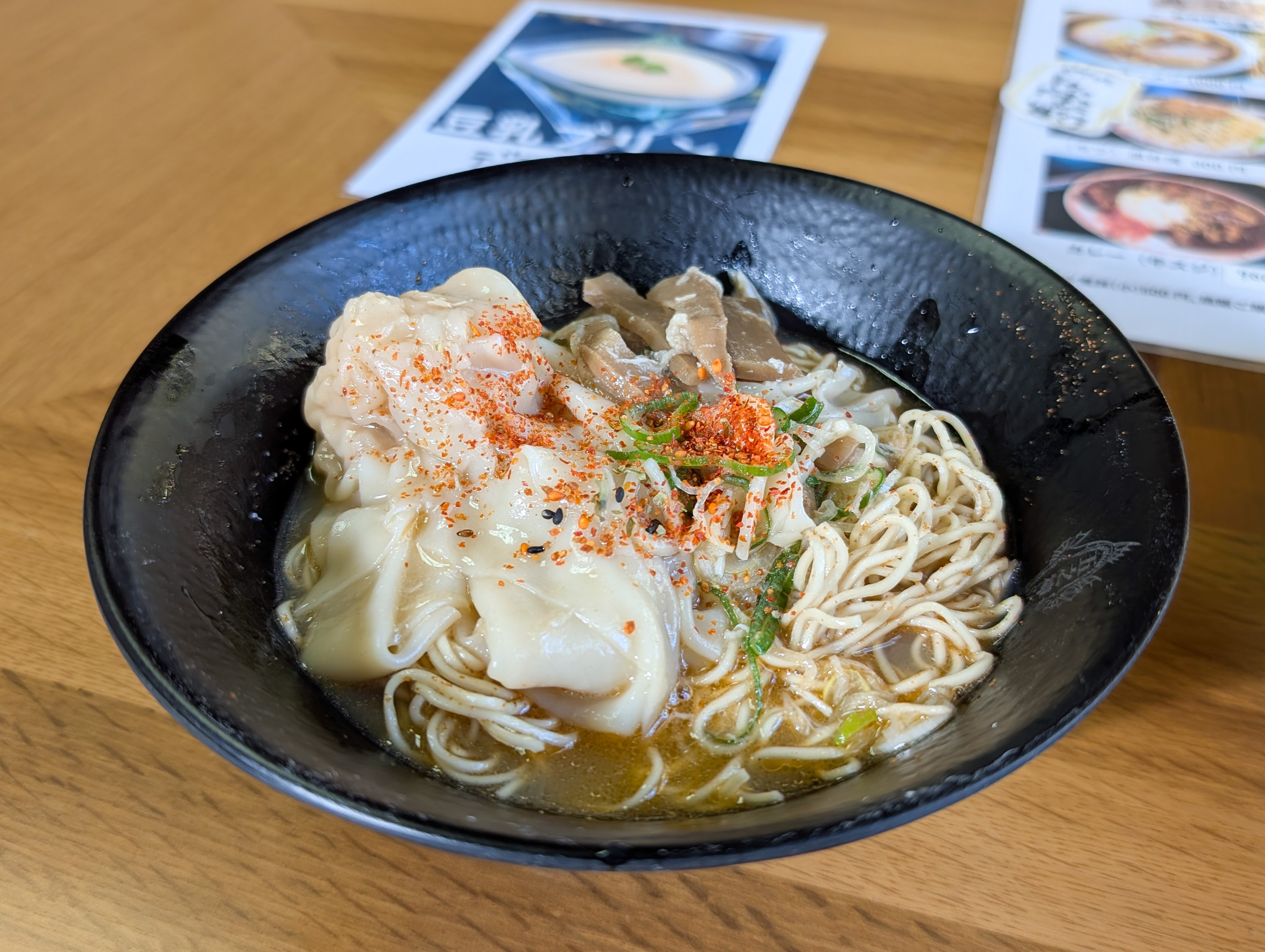 トッピングは、ゴロッとしたワンタン・メンマ・海苔・ネギ、とプルドポークっぽいもの。
