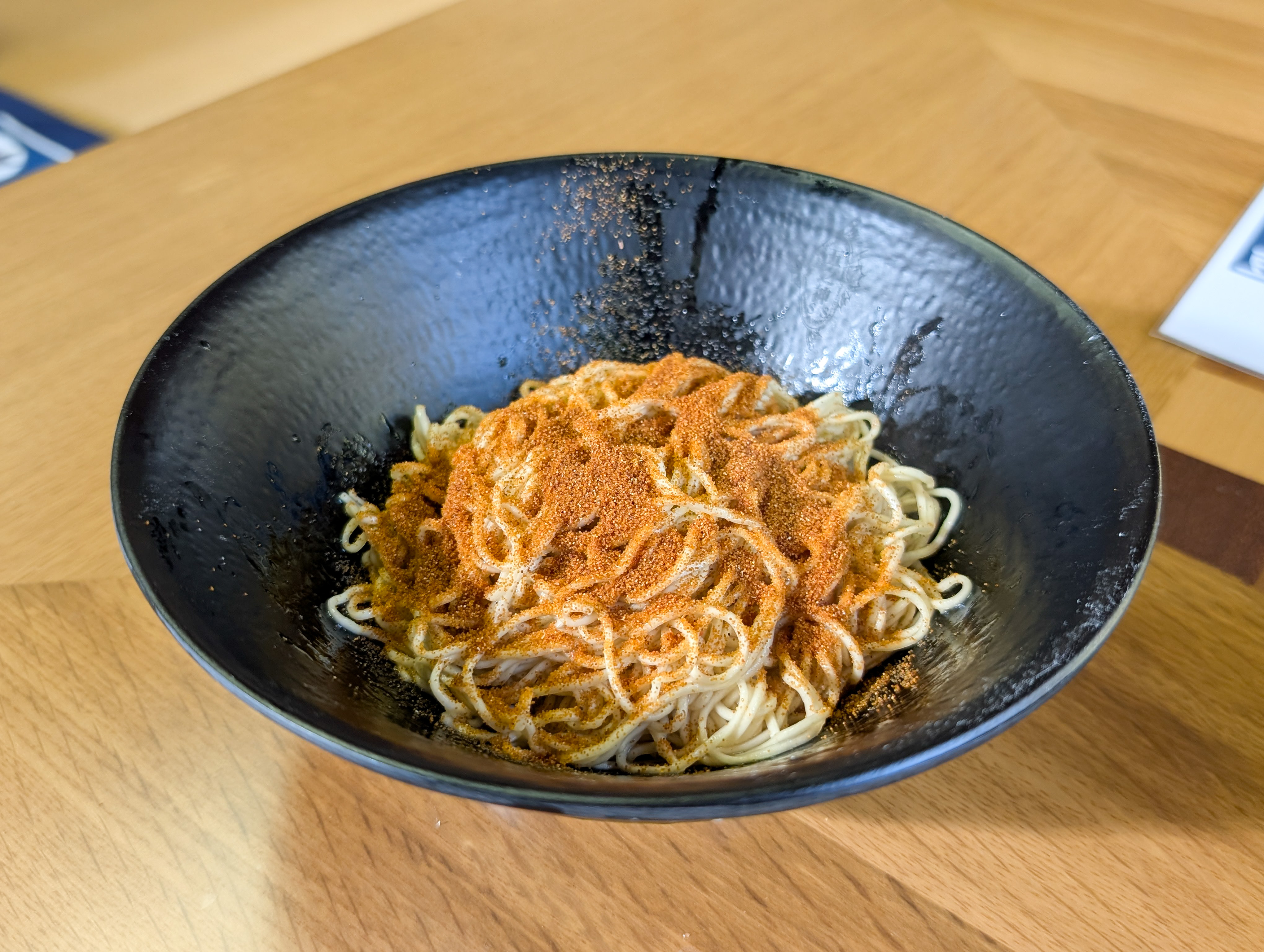 これが謎の「熟成海老卵和え麺」なるもの。なんとなくの記憶あれだが、 “海老の卵って青っぽいとびこ” みたいなものではなかっただろうか? 目の前にあるものは、極細麺の上に大量のケイジャンスパイス的なものがかかっていた。もしかしてこれが海老の卵なの??? 想像してたのとなんか違う。