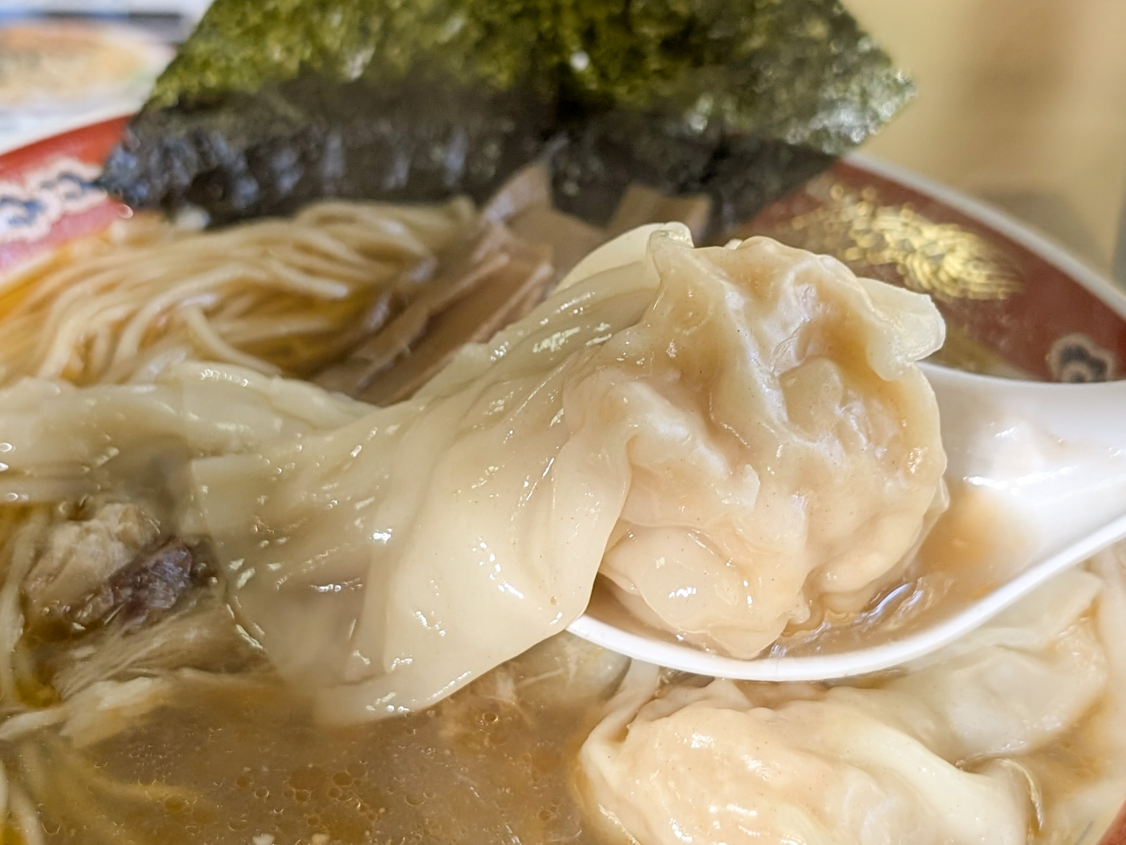 にゅるんっとした皮の中に粗擦りした海老がたっぷり詰まったワンタン。1個が大きくなかなかの存在感。海老出汁との相乗効果で、もはや海。口から喉へ鼻へ、海老の群れが駆け抜けて大騒ぎだ🦐🦐🦐🦐🦐🦐🦐🦐🦐