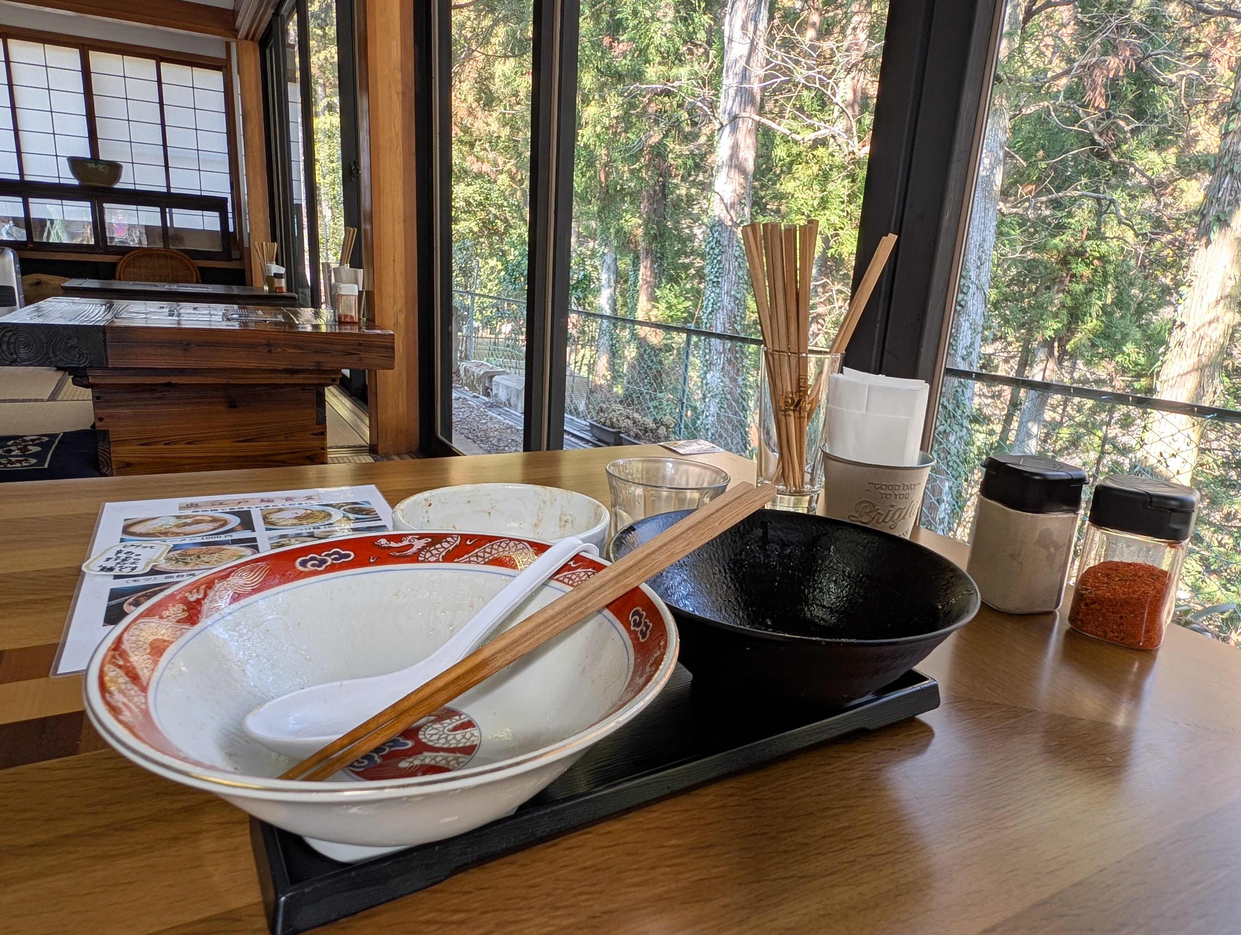 13:05店着で先客は2人と今日は少なめ。座りたい放題なので、誰もいない座敷の窓際に陣取らせて頂いた。