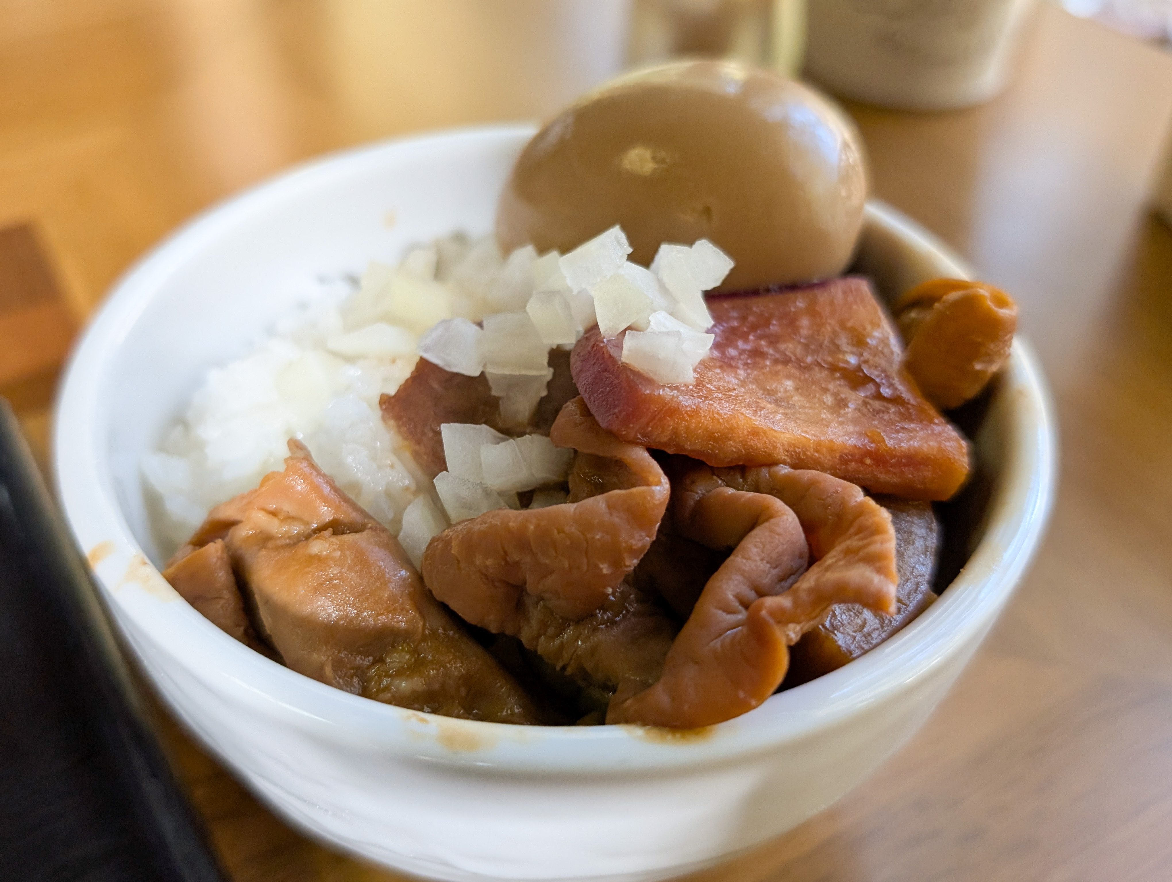 ご飯ものの限定もあると良いのだが、再び「もつ煮丼」をチョイス。なぜか前と同じで味玉がこちら側に乗ってくるのは、結局飯に乗せることを知っての配慮か、たまたまの偶然か!?