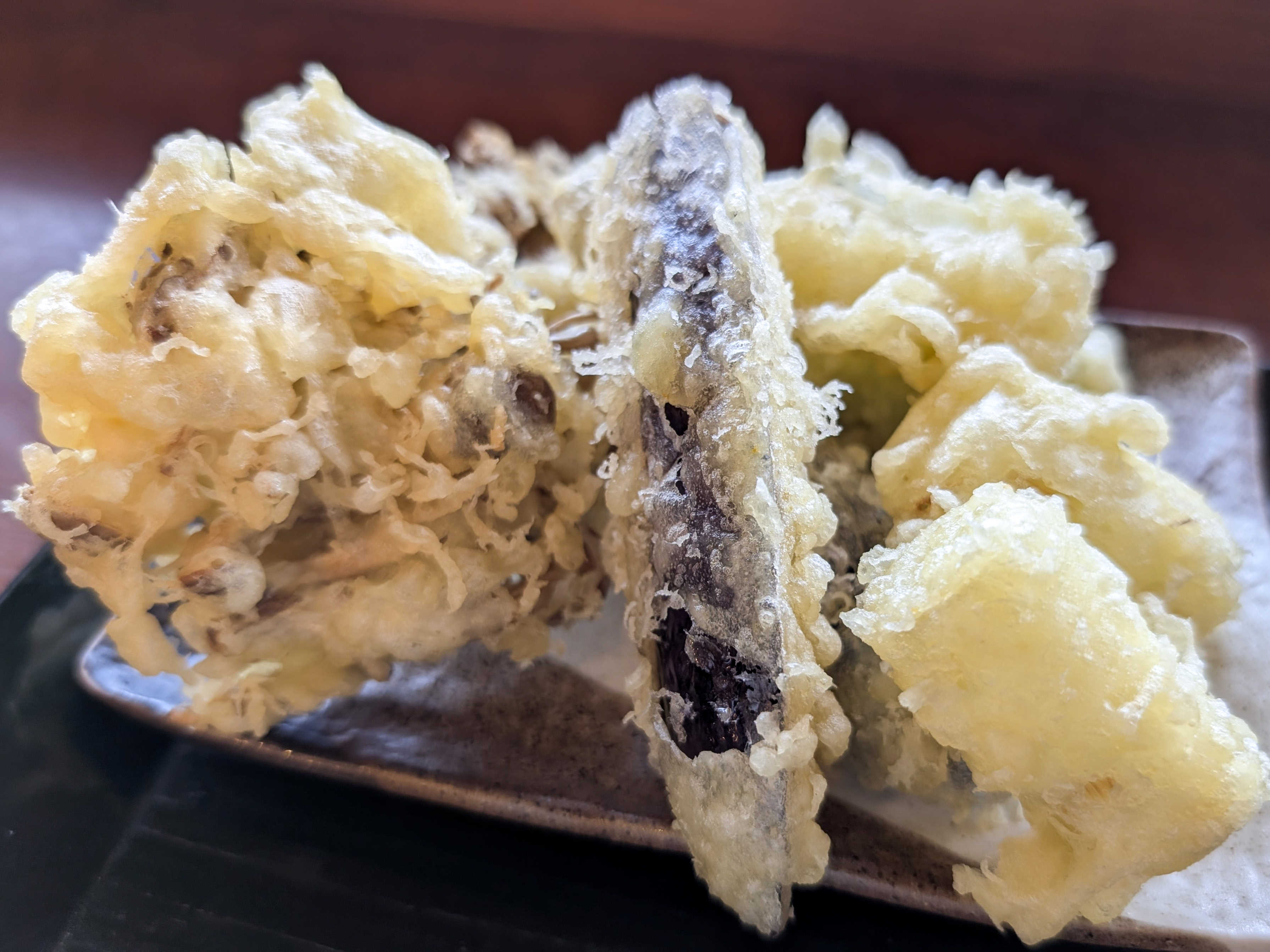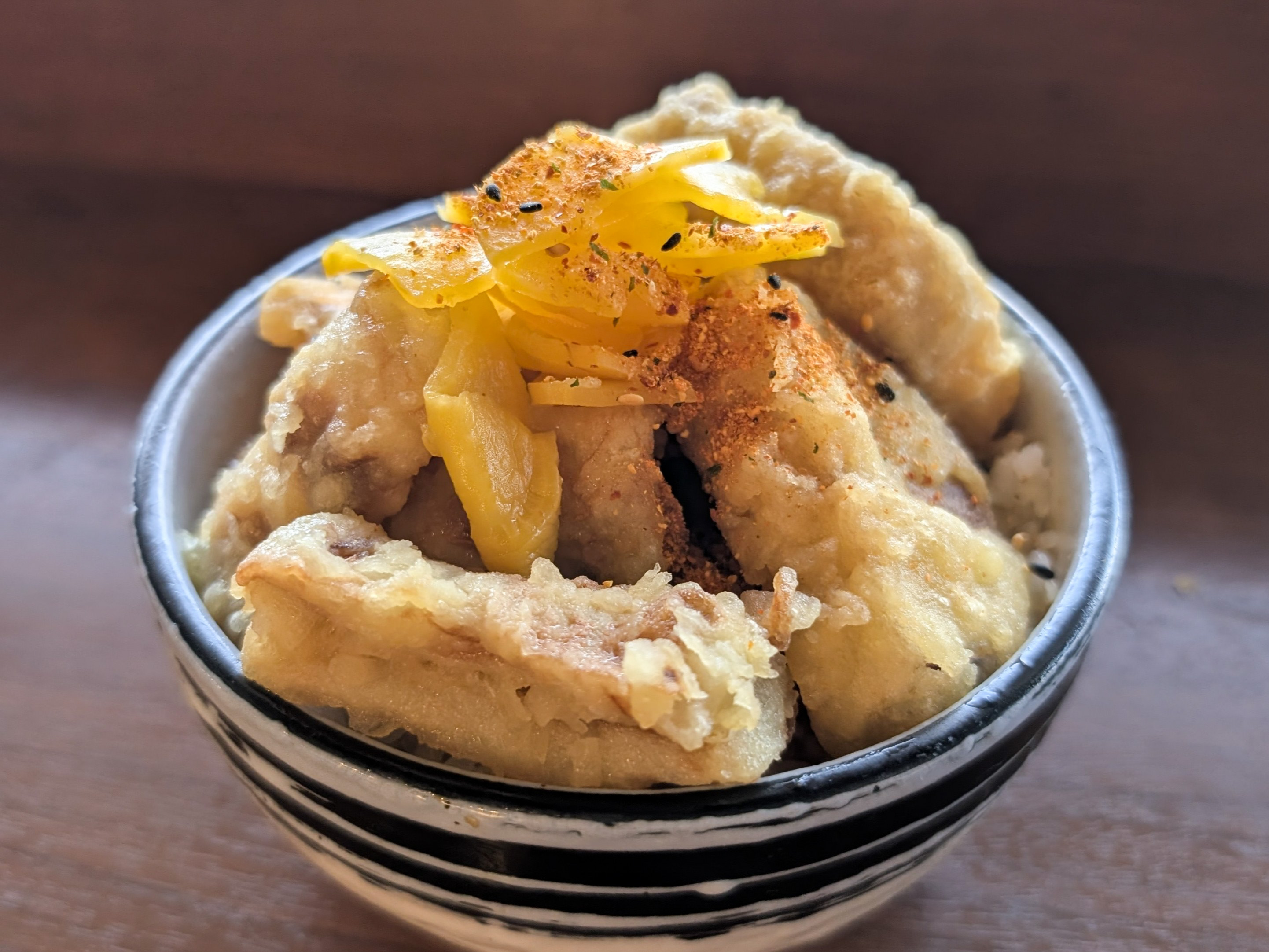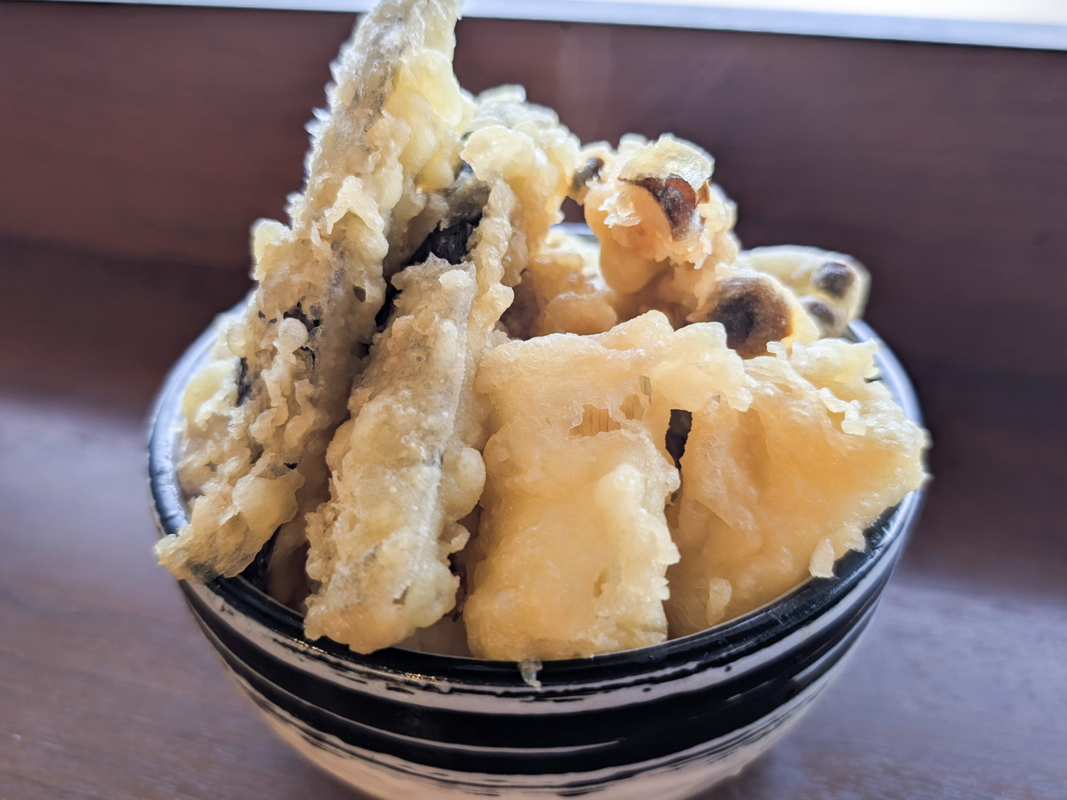 して、次手の天丼は、サツマイモ・竹輪・ニンジンを同じように積み上げる。これがまた初手と差別化できていて良き。サツマイモはホクホクして如何にも野菜天を食べてる感が強く、ニンジンはネギに劣らす甘い。唯一野菜じゃないちくわは、もはや肉枠。