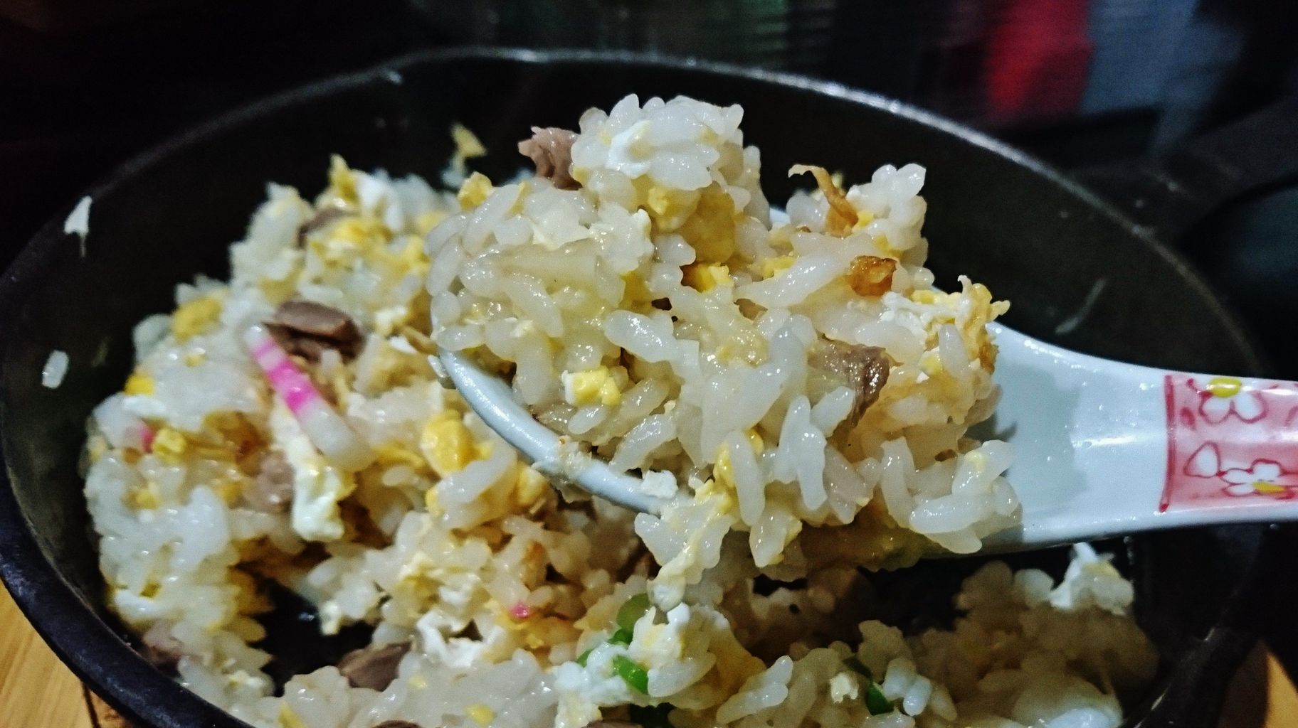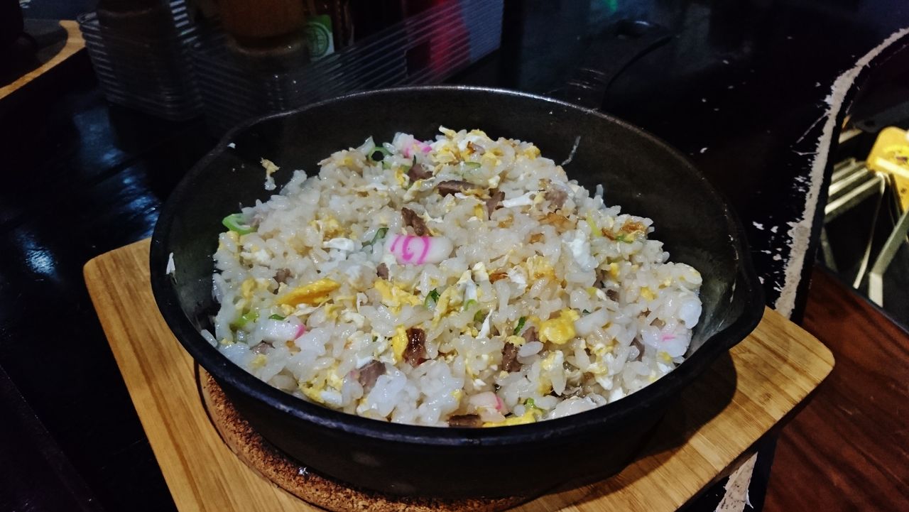 このスキレットはお洒落食器として使われているのではなく、ちゃんとガチで使われているから出来上がった炒飯は終始超激熱。うかつに口に入れると、火傷しますのでご注意を。