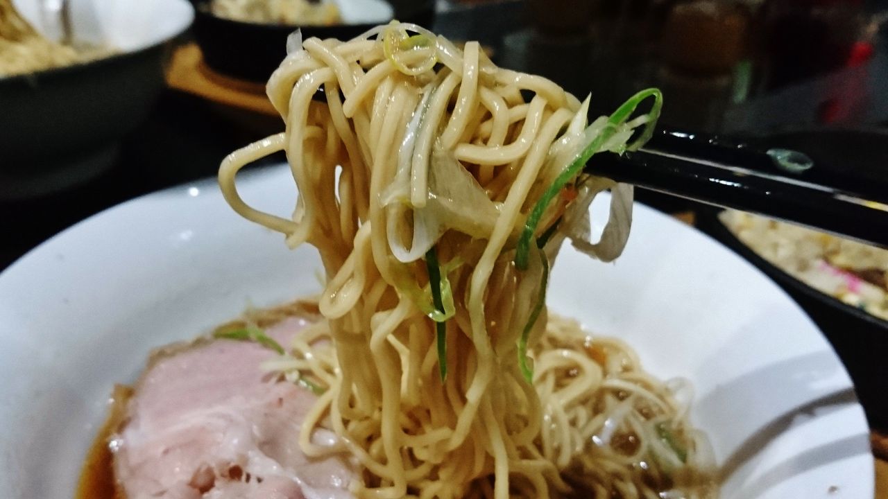 麺はネギと絡めて啜り上げます。ツルパツでしっかりした食感は、この濃口スープと相性がイイ。
