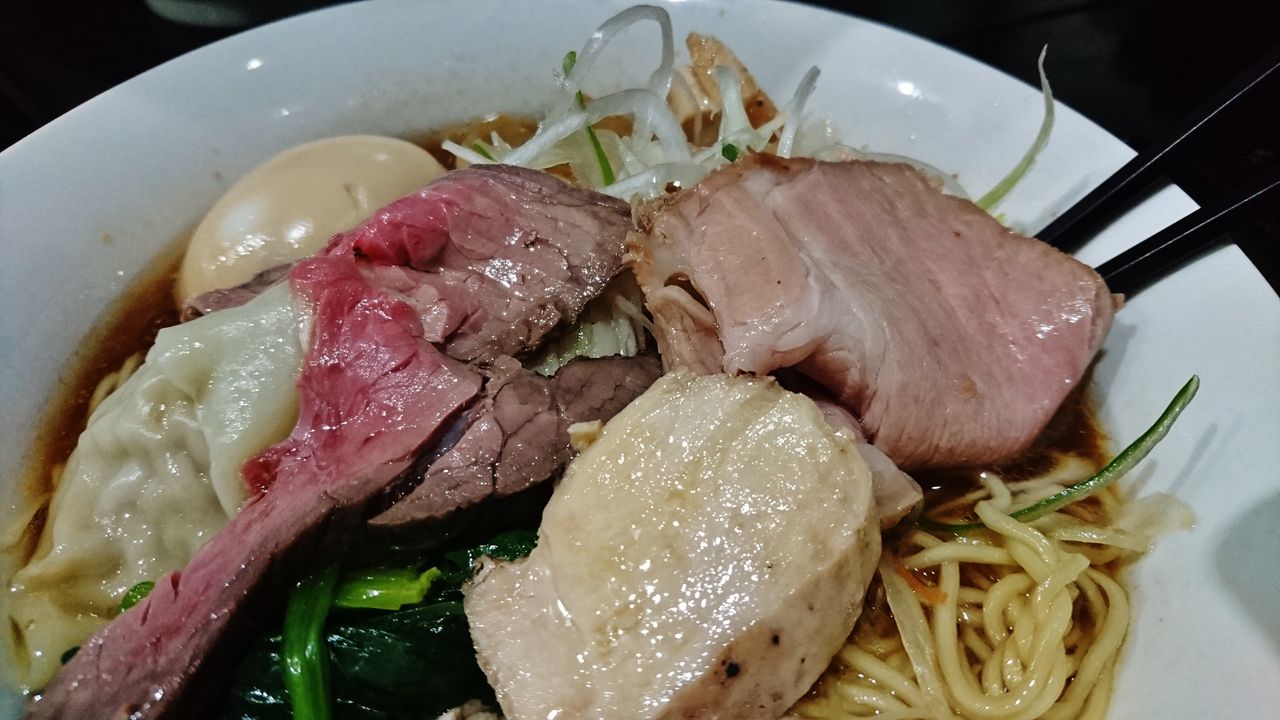 トッピングは、チャーシュー3種・メンマ・ホウレン草・ナルト・ネギ・味玉(特製分)・ワンタン(特製分)。