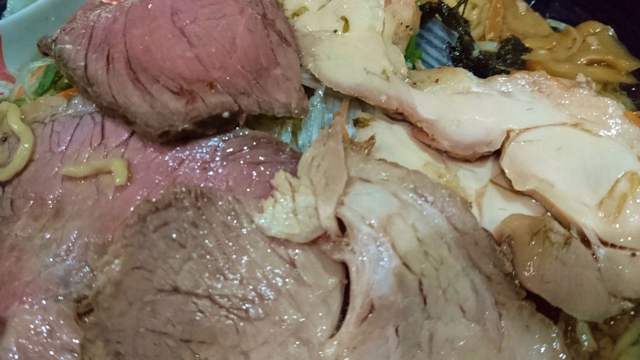 チャーシューは、牛・豚・鶏のビポチ3種盛。