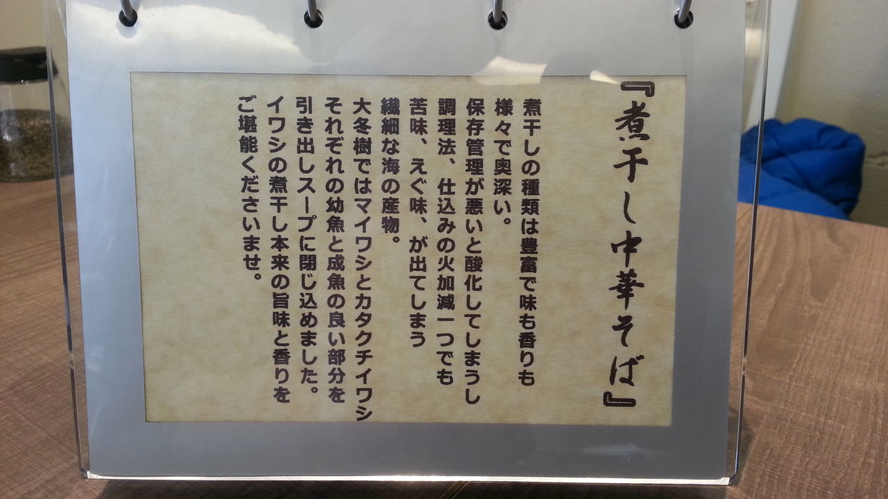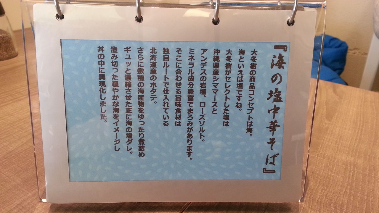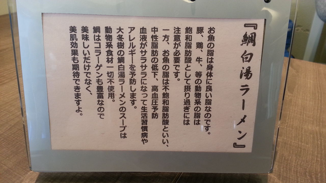 テーブルには、プロフィールの他に麺4種の説明文がある。店のコンセプトが海だから、魚の事が多く書いてあり何だかスローフードのうんちくみたいだ。このラーメンを食べるとより健康になれる気が・・・。