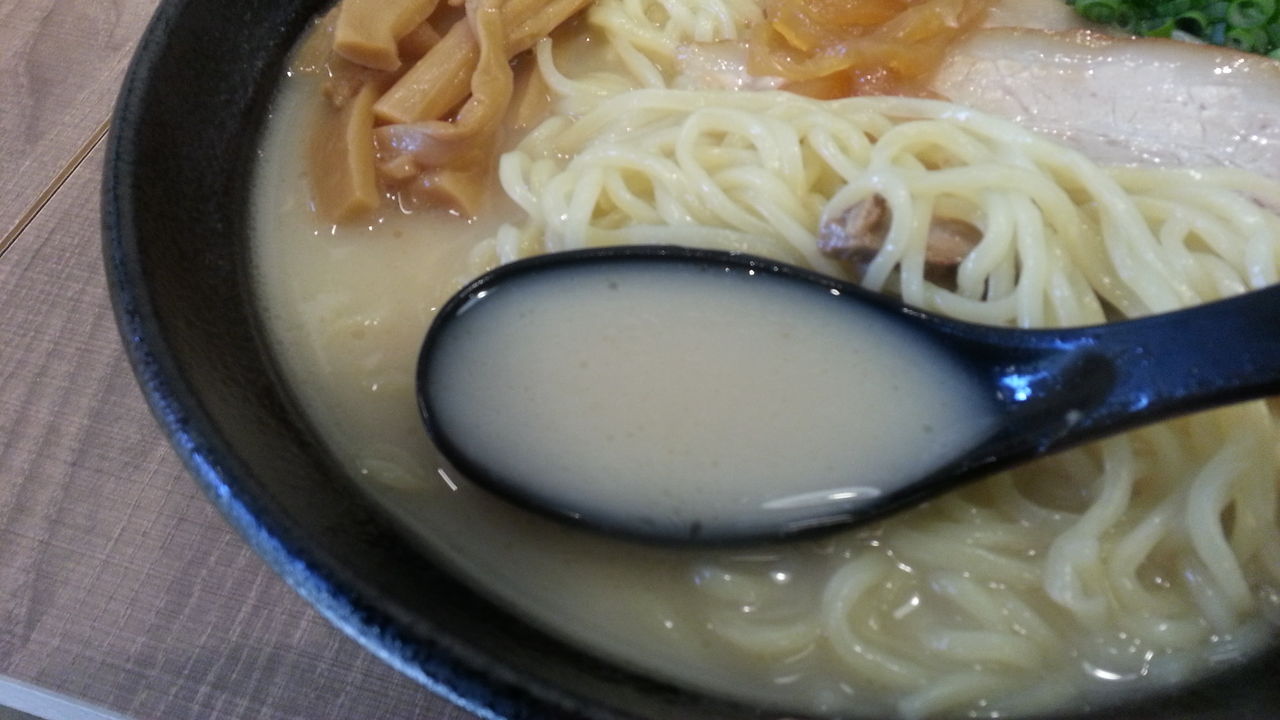 麺は、2.5mm角くらいのちょっとウェーブした中太麺。ラーメンによって麺が違うみたいで、同行者が食べていた麺は1mm超の細麺だった。茹で上がりは柔らかめで、表面がツルツルのモチッとした食感で美味しい。悪い表現をするとソフト麺的な感じもするが、このスープには良く合っているんじゃないだろうか。