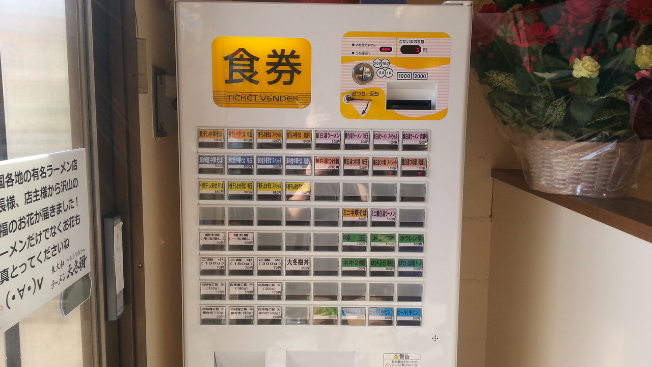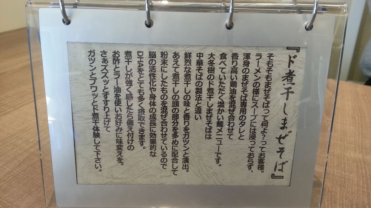 メニュー構成は、麺物に「煮干し中華そば」「鯛白湯ラーメン」「海の塩中華そば」「鯛白湯つけめん」「ド煮干しまぜそば」の5種にそれぞれ「味玉」「スペシャル」「肉増し」などの上物違い。飯物に「ご飯」「肉味噌ご飯」「肉味噌ご飯卵のせ」の量違いと「大冬樹丼」。「白ワイン」や「ローストビーフ」まであった。
