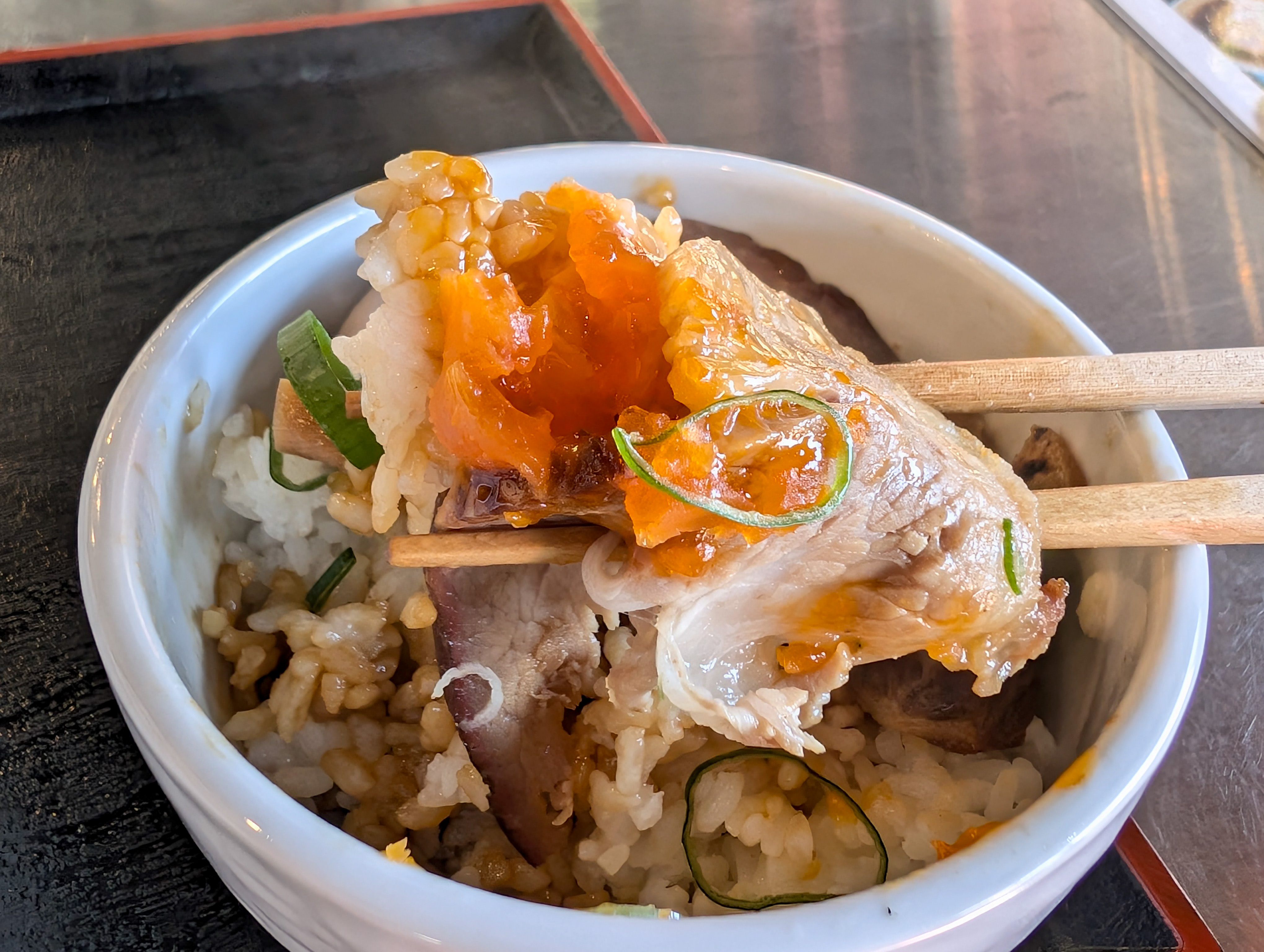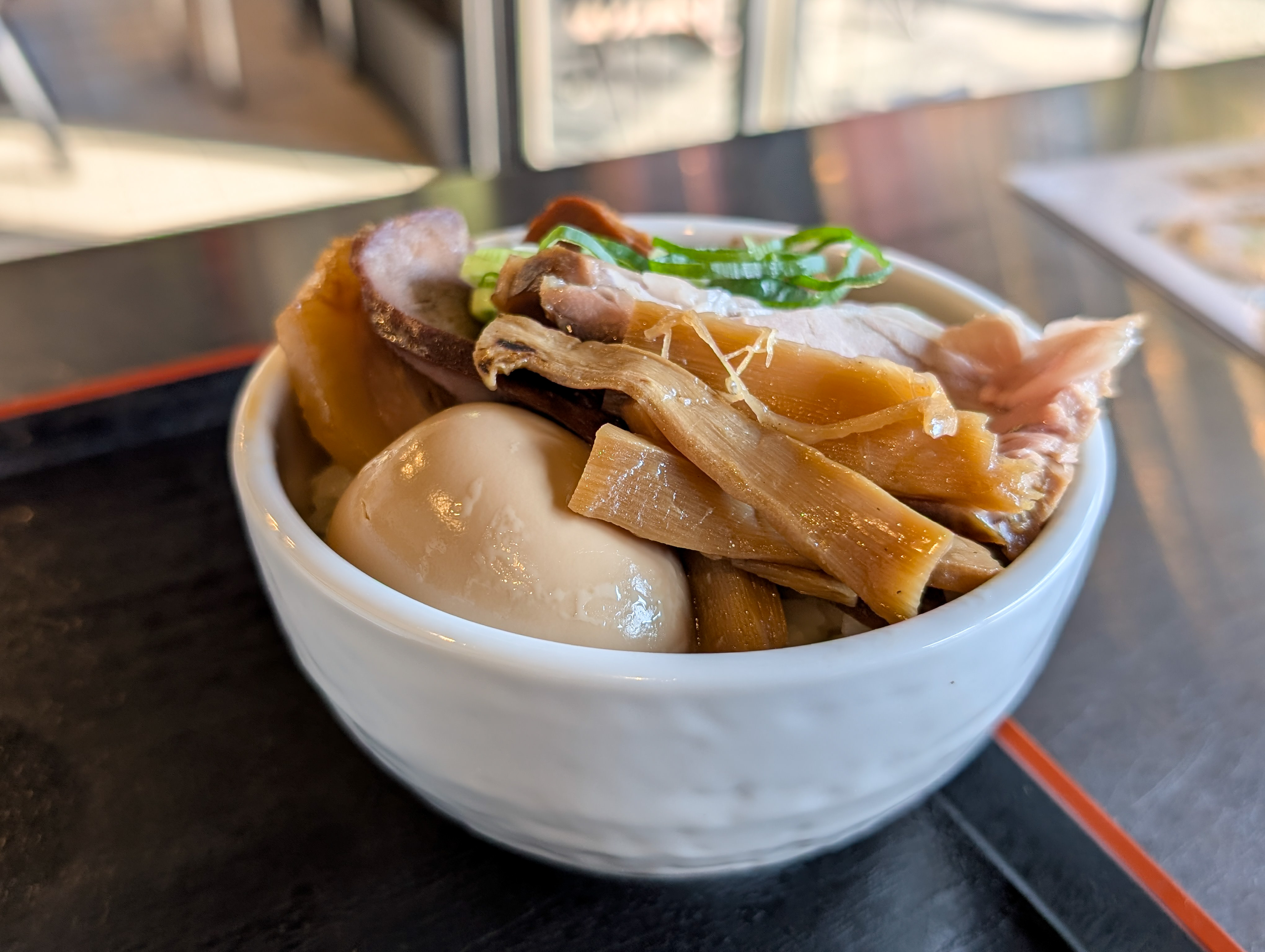 こちらは初めましての「焼豚ご飯」。らーめんサイドに居ねぇなと思っていた味玉がこんな所に潜んでいました。