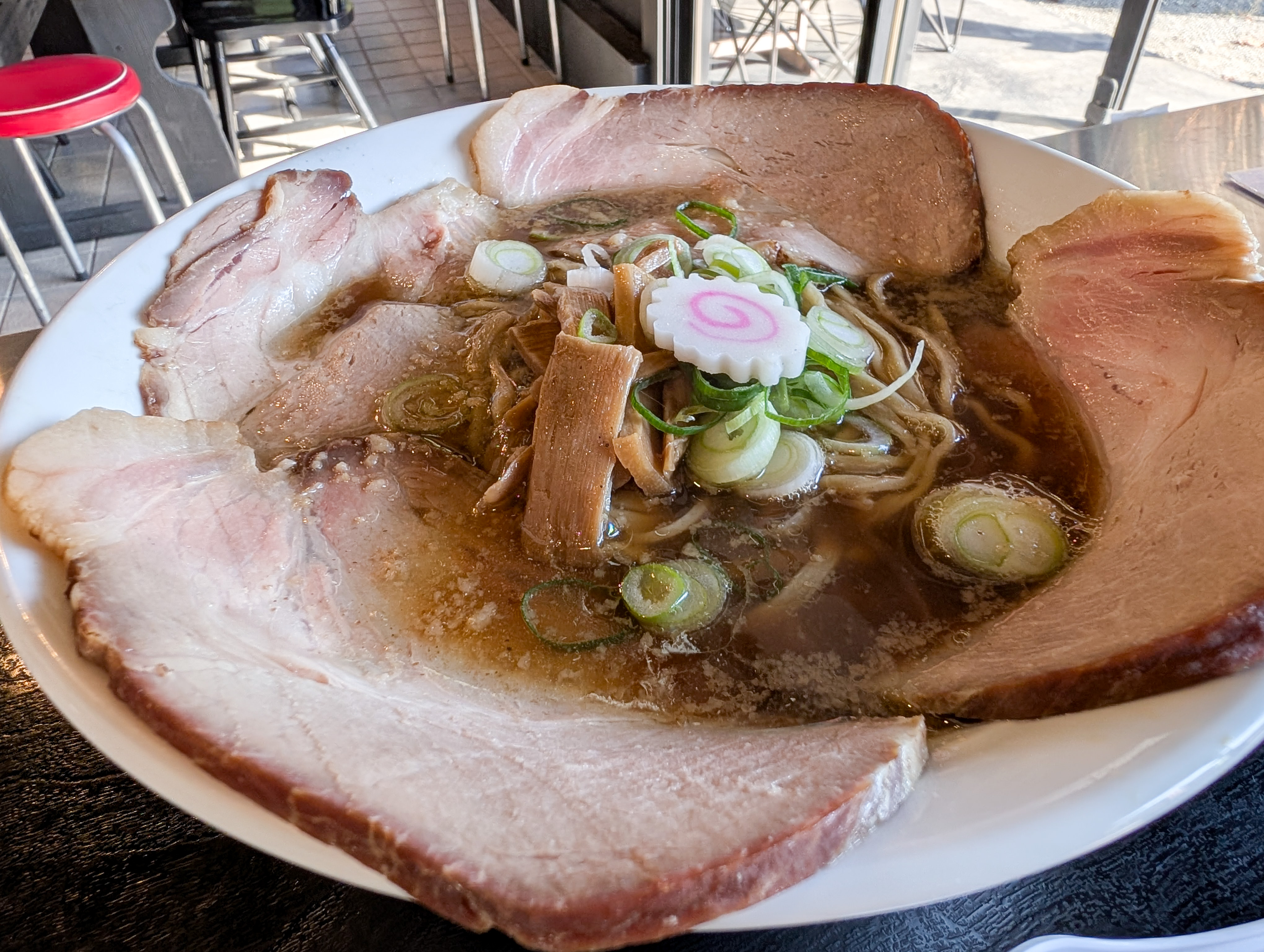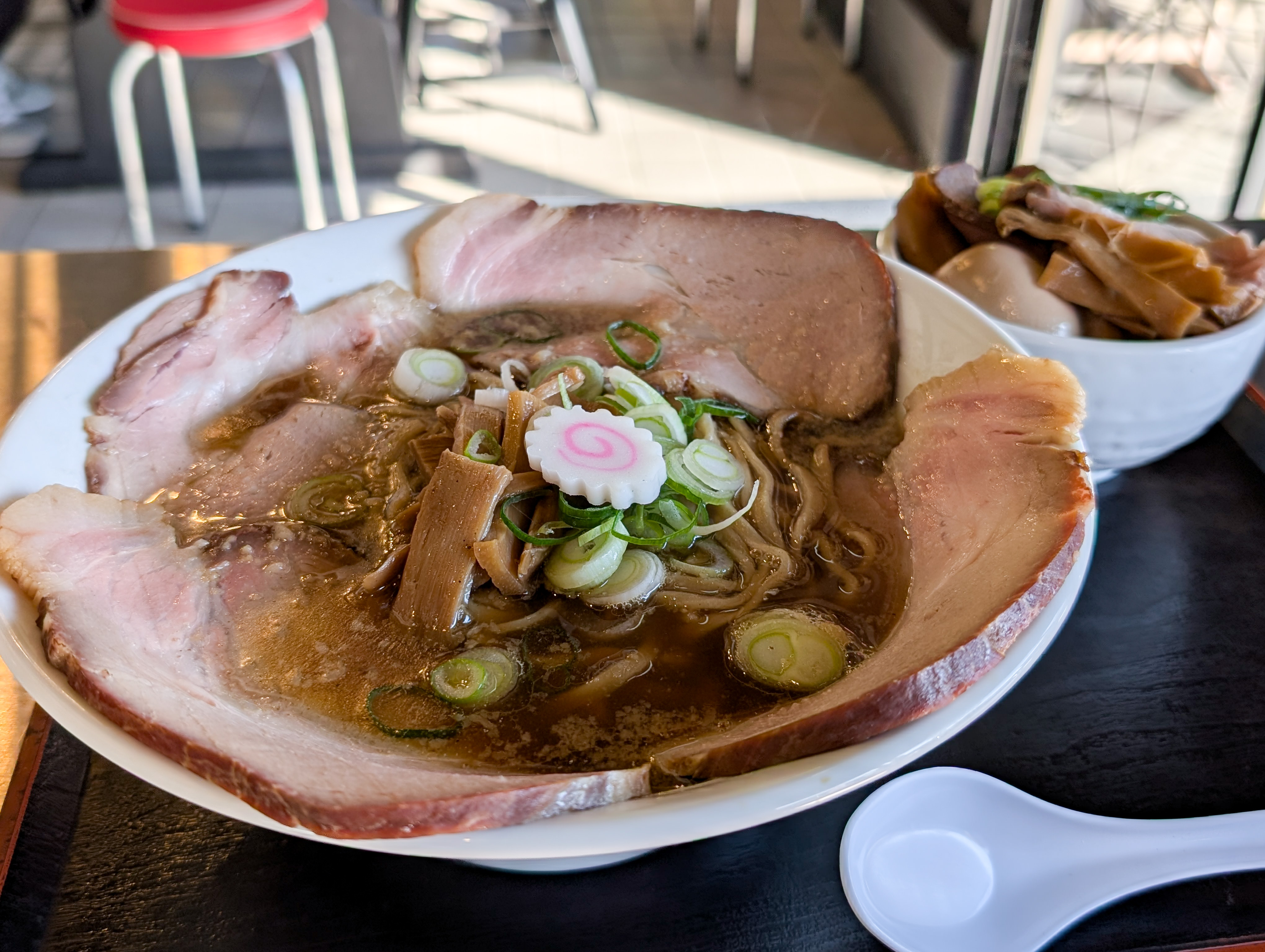 大きなチャーシューで内壁をぐるりと囲う、なかなかインパクトあるビジュだ。まるで肉の日みたい…なんて思ってると、中から「ど~もこんにちは!」って五ノ神製作所の伊藤社長が現れた。今日は奥江戸でアルバイトだそうです。夏から3回ほどここに来てますが、エンカウント率100%。もしかしてバイトリーダーですか⁇ 初訪のときにも書きましたが、ここは五ノ神系の直営ではありません。ただ毎回伊藤氏にも会うってこともあり、もはや “アナザー五ノ肉” ではないかと思ってしまうのも無理もない。