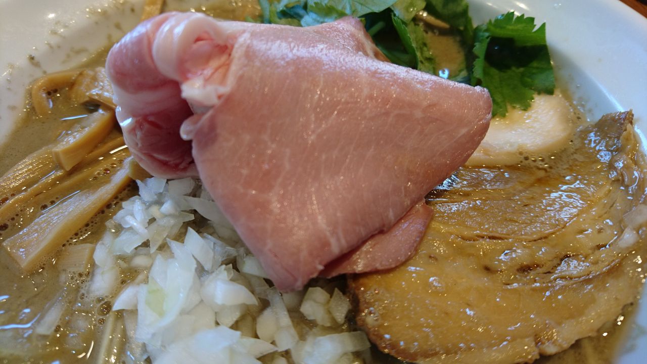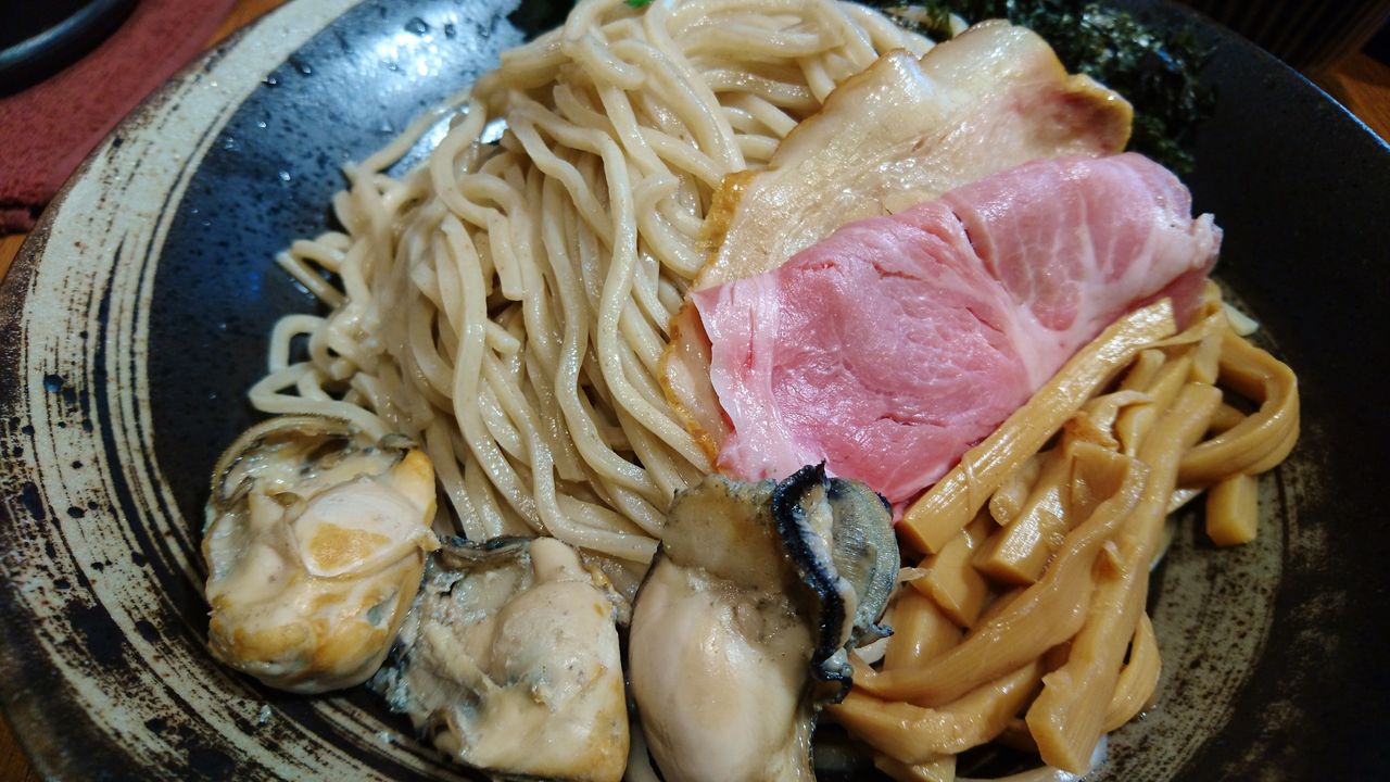 麺側だけに、カキのソテー・ほぐした海苔・メンマ・水菜・チャーシュー2種がトッピング。