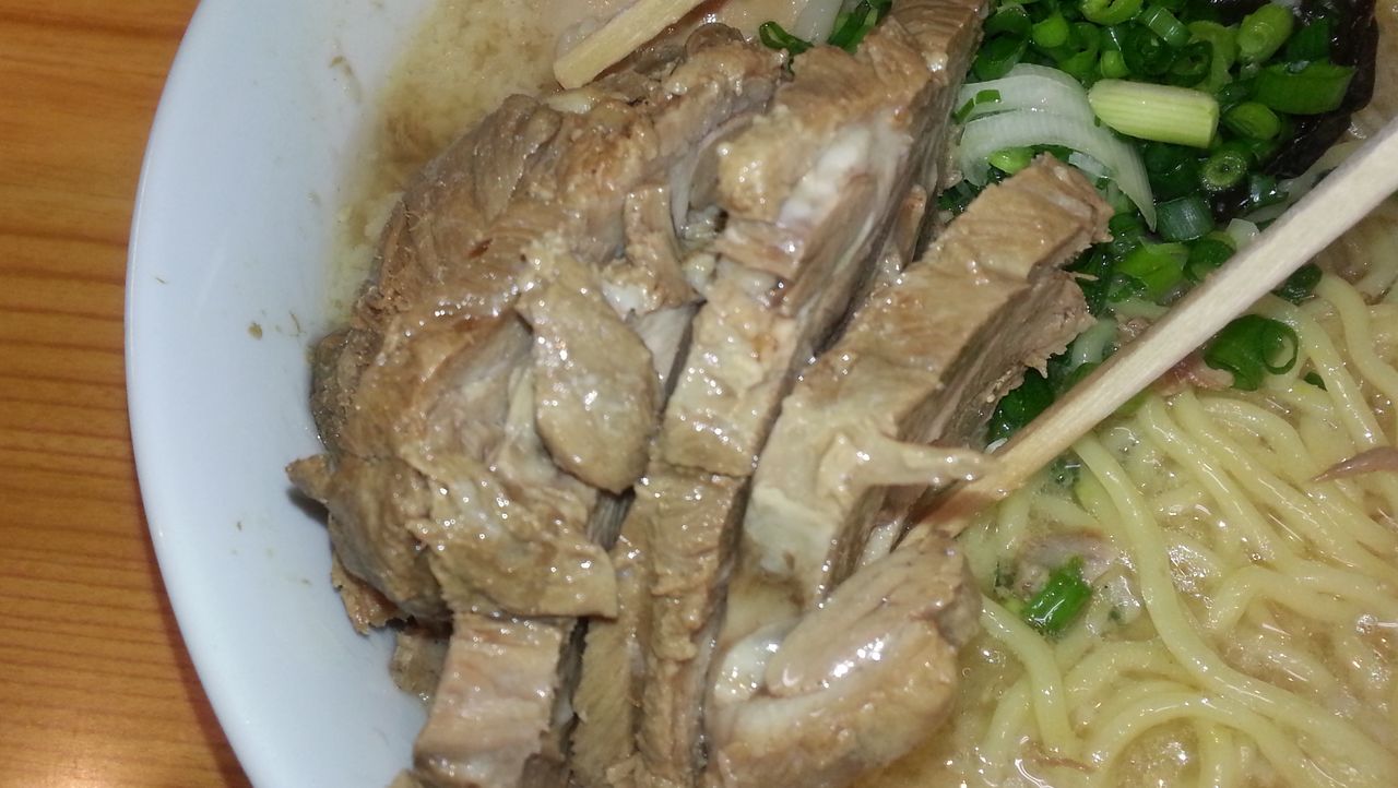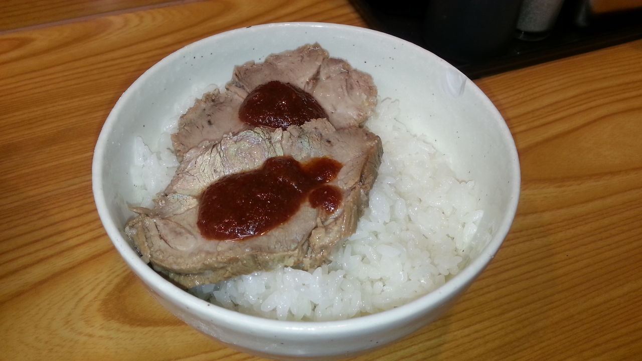 チャーシューは繊維を切るように厚くスライスされ、ホロッと裂けるような食感。さらにスープで温めてから食べると。より柔らかくなって旨い。 この柔らかくなった肉をライスと合体。