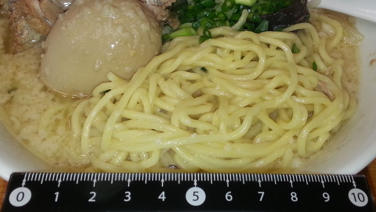 麺は、低加水気味の細ストレート。替え玉見るかぎりでは150g前後ってところ。 替え玉の方が硬く、個人的にはこんくらいが好き。
