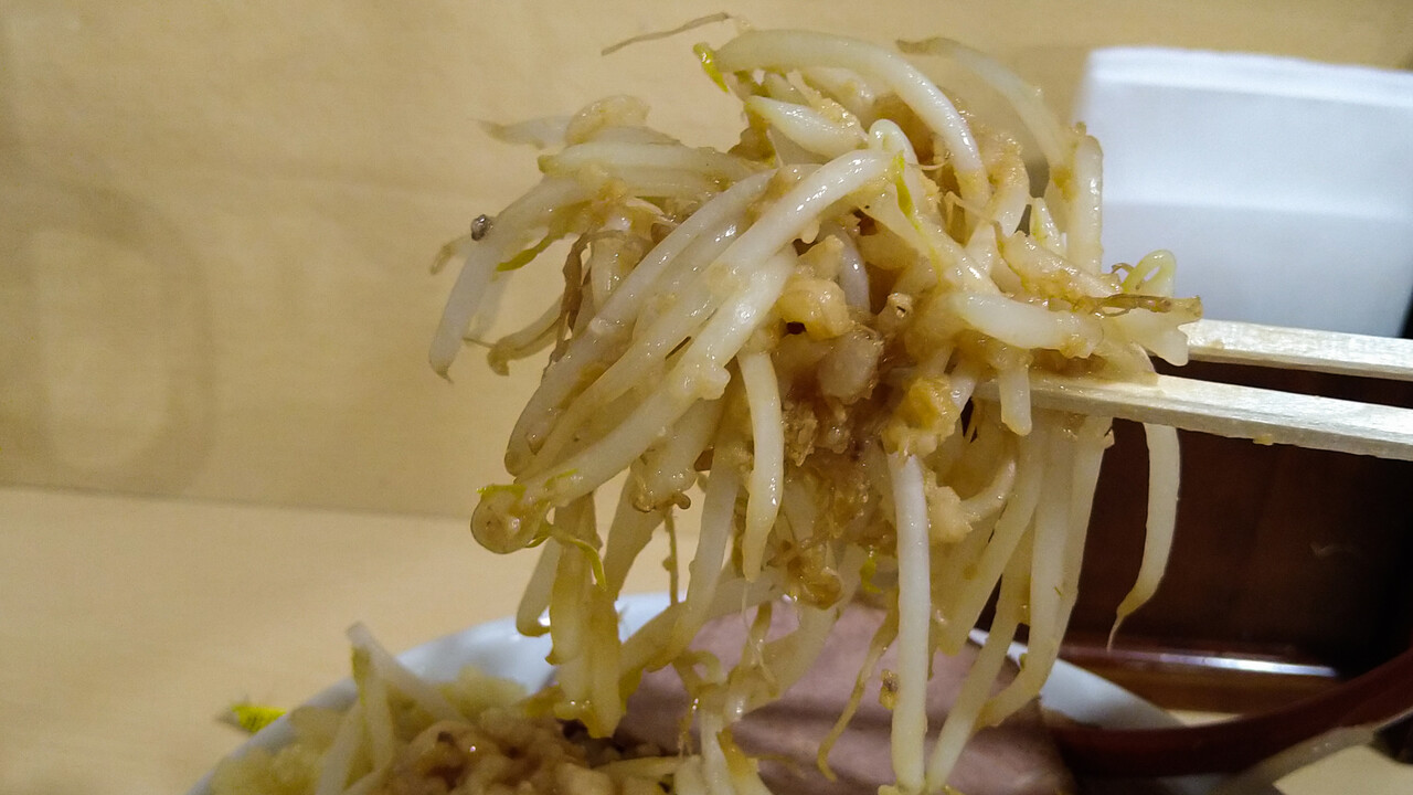 これ茹でた?って感じのザックザクタイプ。味脂が良い感じに絡まって、まるで旨いモヤシ炒めを喰らっているよう。これだけで、ごはんが無限に喰える。