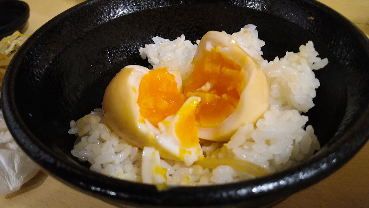 んで、玉子ド~ン。茹でたまご?味玉?真っ白だったのに、スープに浸かって味玉色に染まっていた。ん?黄身にも味が入っているような・・・