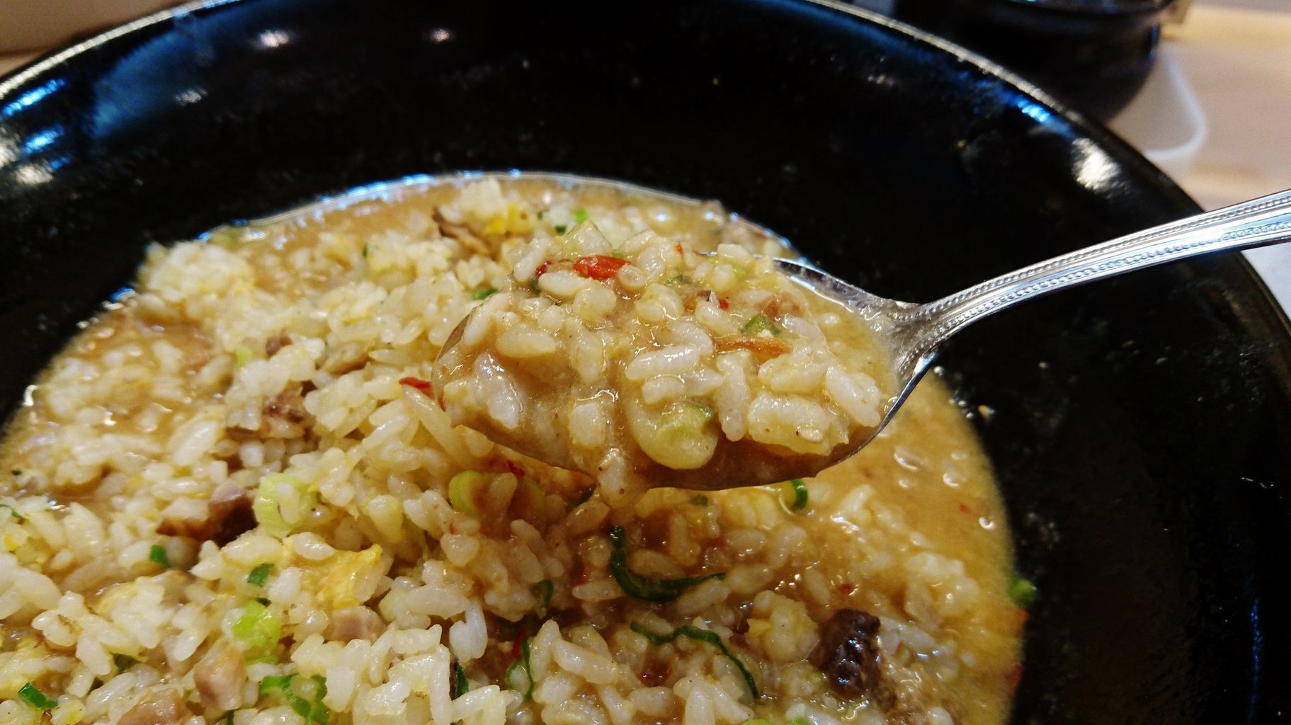 卵とネギとチャーシュー、至ってシンプルなチャーハンです。しかもオイリーで、塩気も薄く、魚介チックな変わった味がするときたもんだ・・・