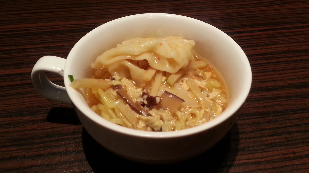 「焼きそばの麺に海老ワンタン入り酸辣湯をかけたもの」
