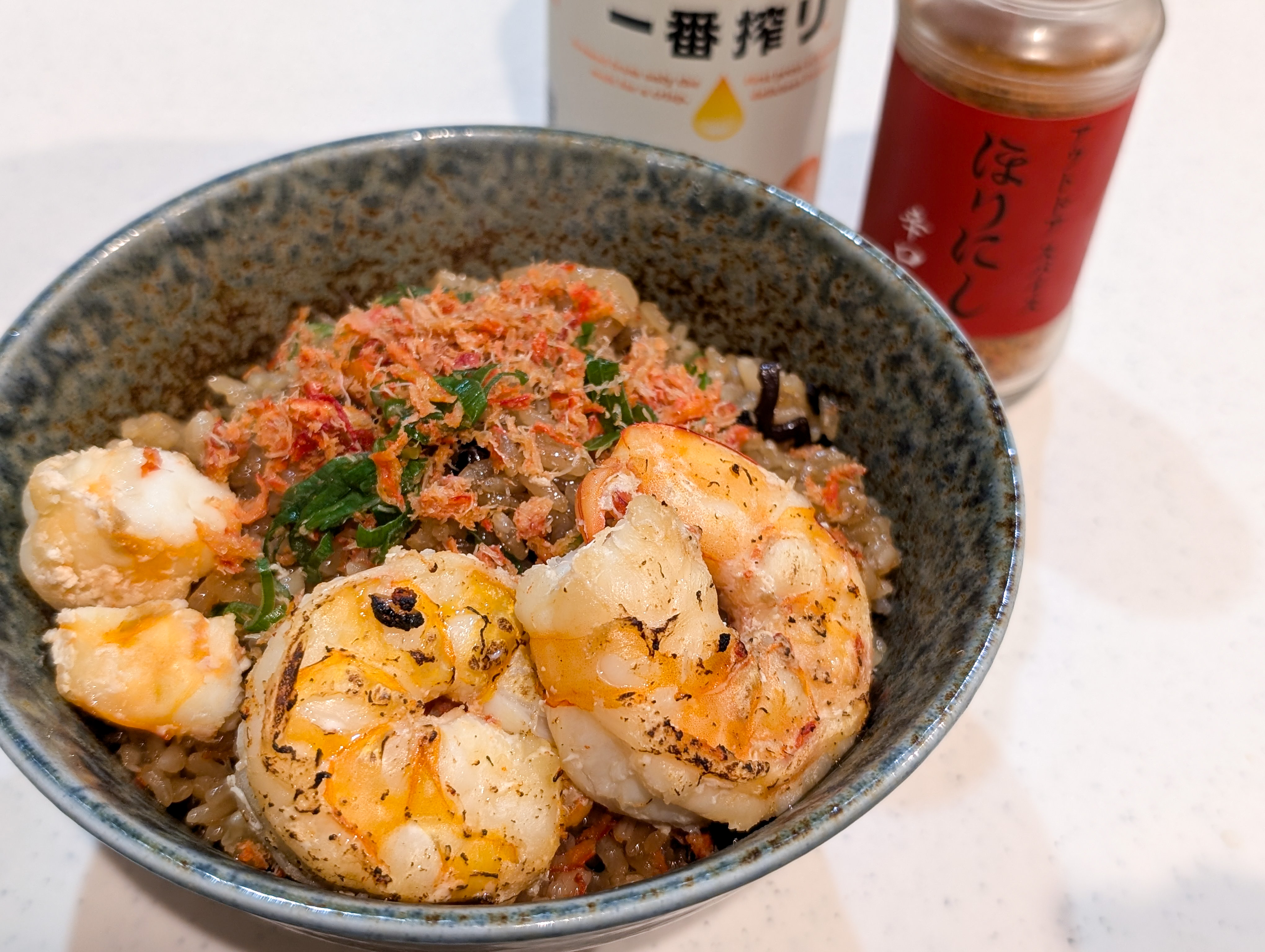 持ち帰りの「海老蟹おこわ」は、夜食として頂きました。ぶりぶりの海老は、かる~く炙って赤ほりで!