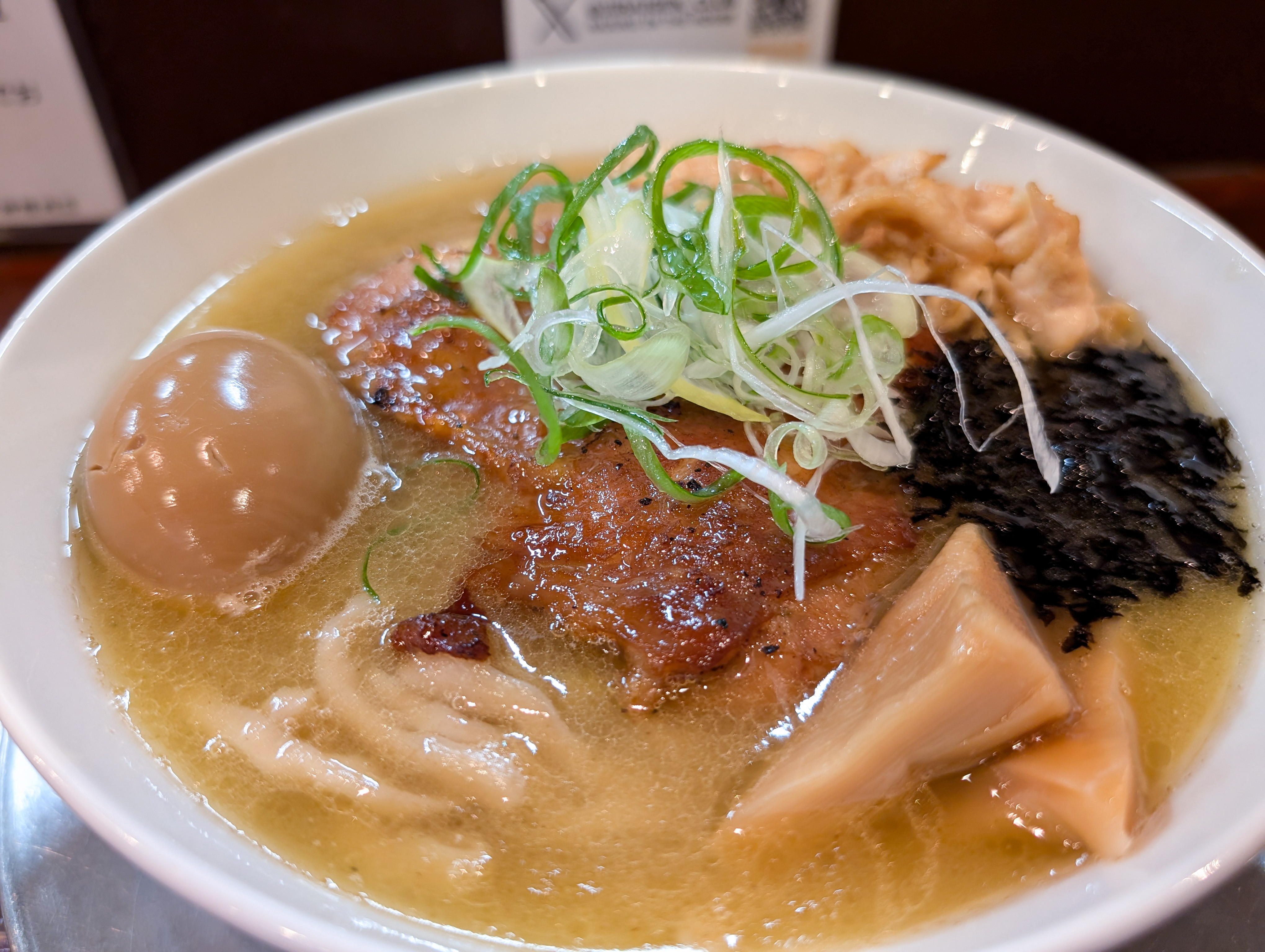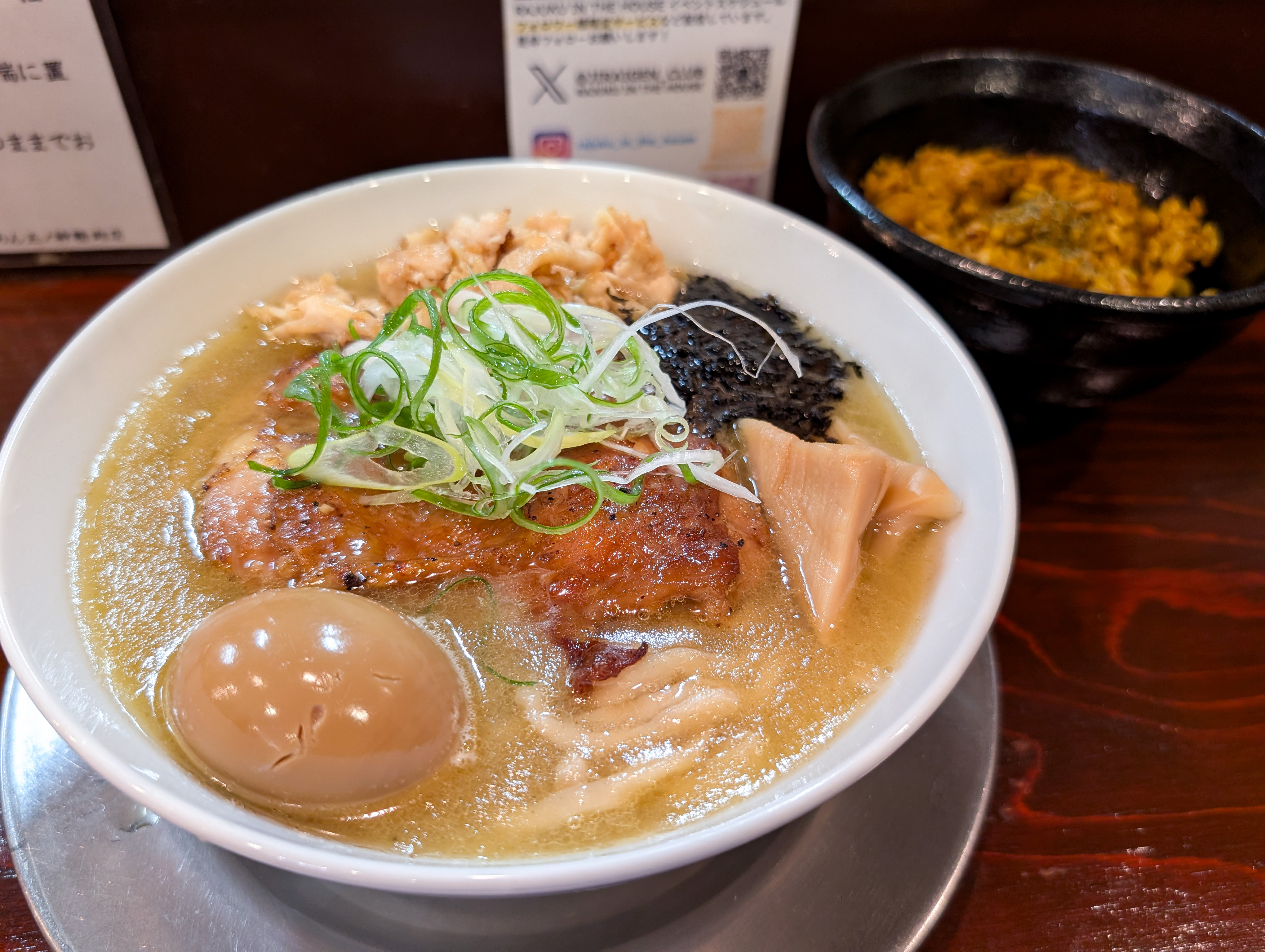 トッピングは、炭焼きチキン・味玉・メンマ・ネギ・バラ海苔・細かい鶏肉的なやつ。