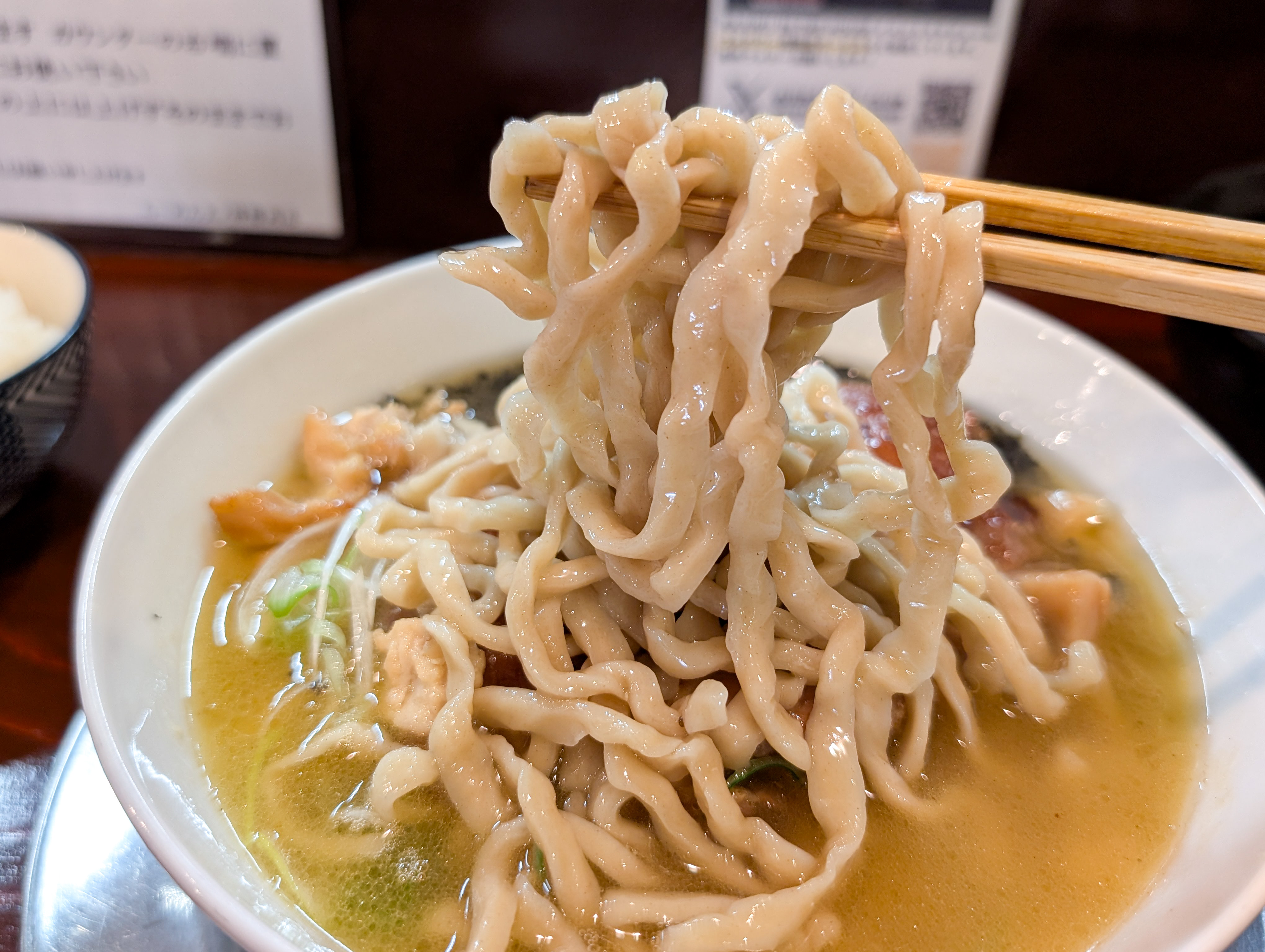 麺はグニグニのピロピロ系。久しく食べていないが、「いつ樹」の鯛塩と同じ麺だろうか。なによりこのグ二っとした歯触りが、鶏モモ肉のギュッとした食感に負けていない。ペッタリした痛風仕立ての鶏白湯スープとも相性が良い。やっぱ鶏白湯好きだわ。
