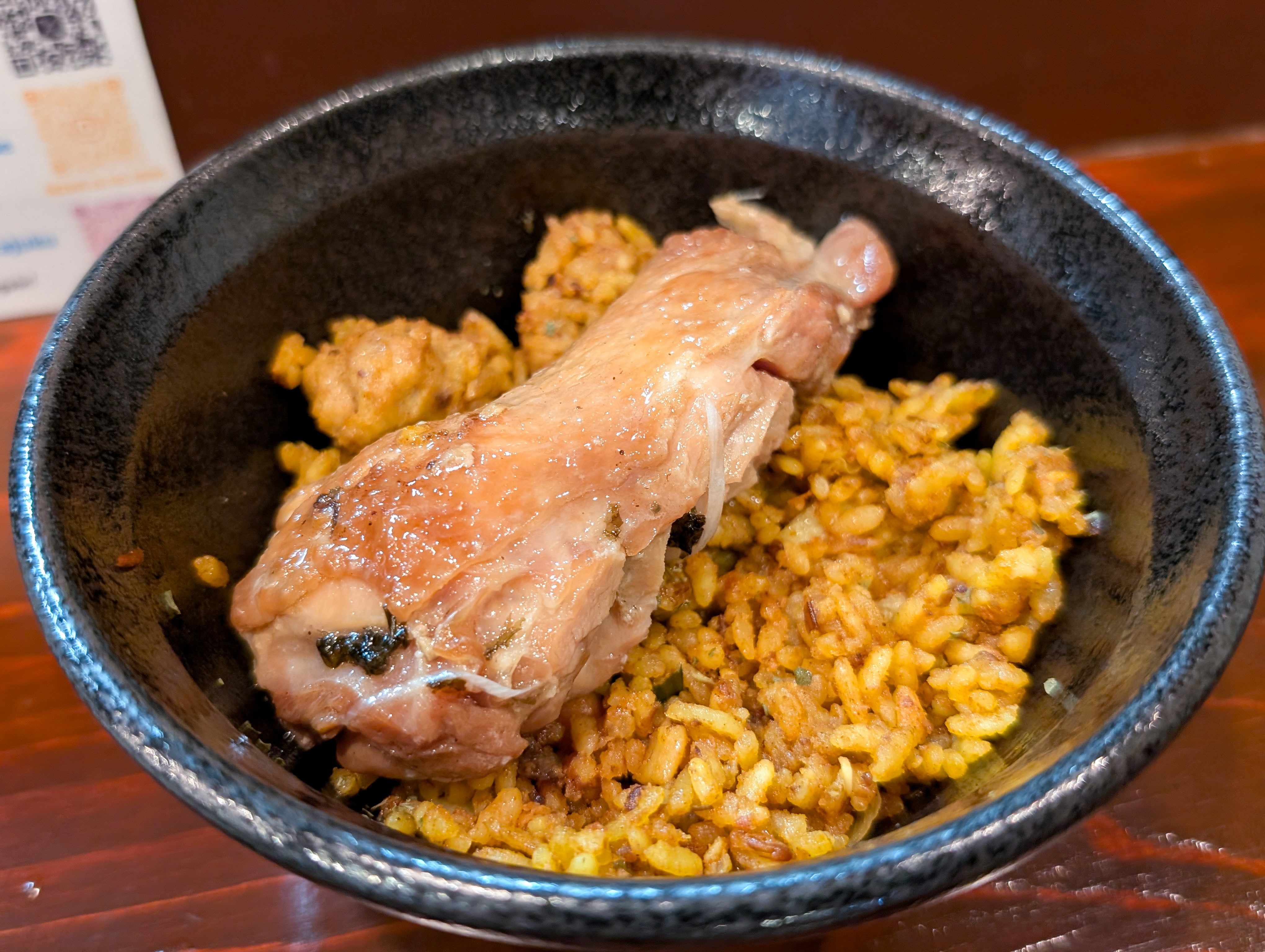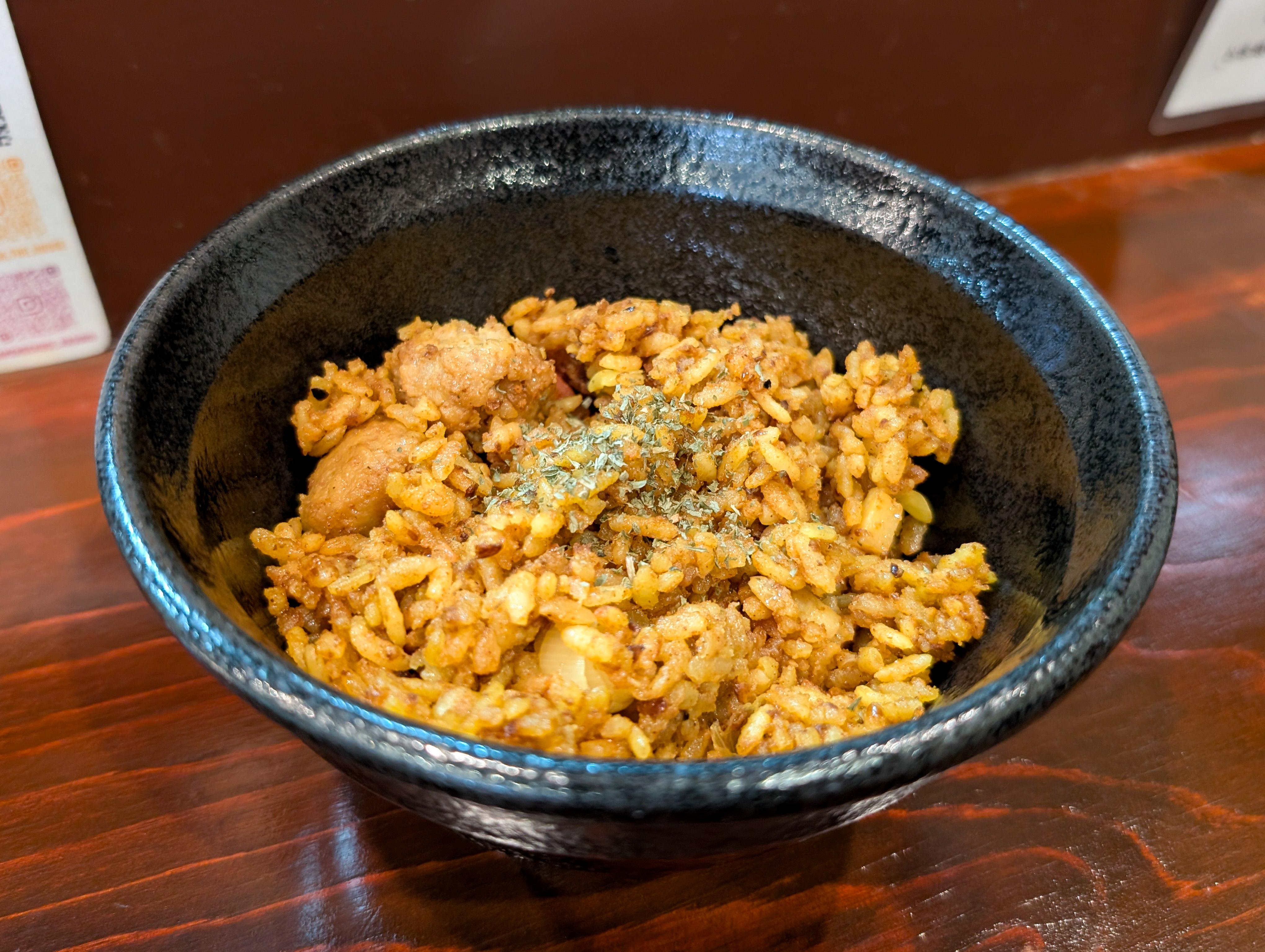ちょっと意表を突かれたのが、サイドメニューの「カレー飯」。てっきりカレーオンザライスなのかと思いきや、なんと炊き込み系。