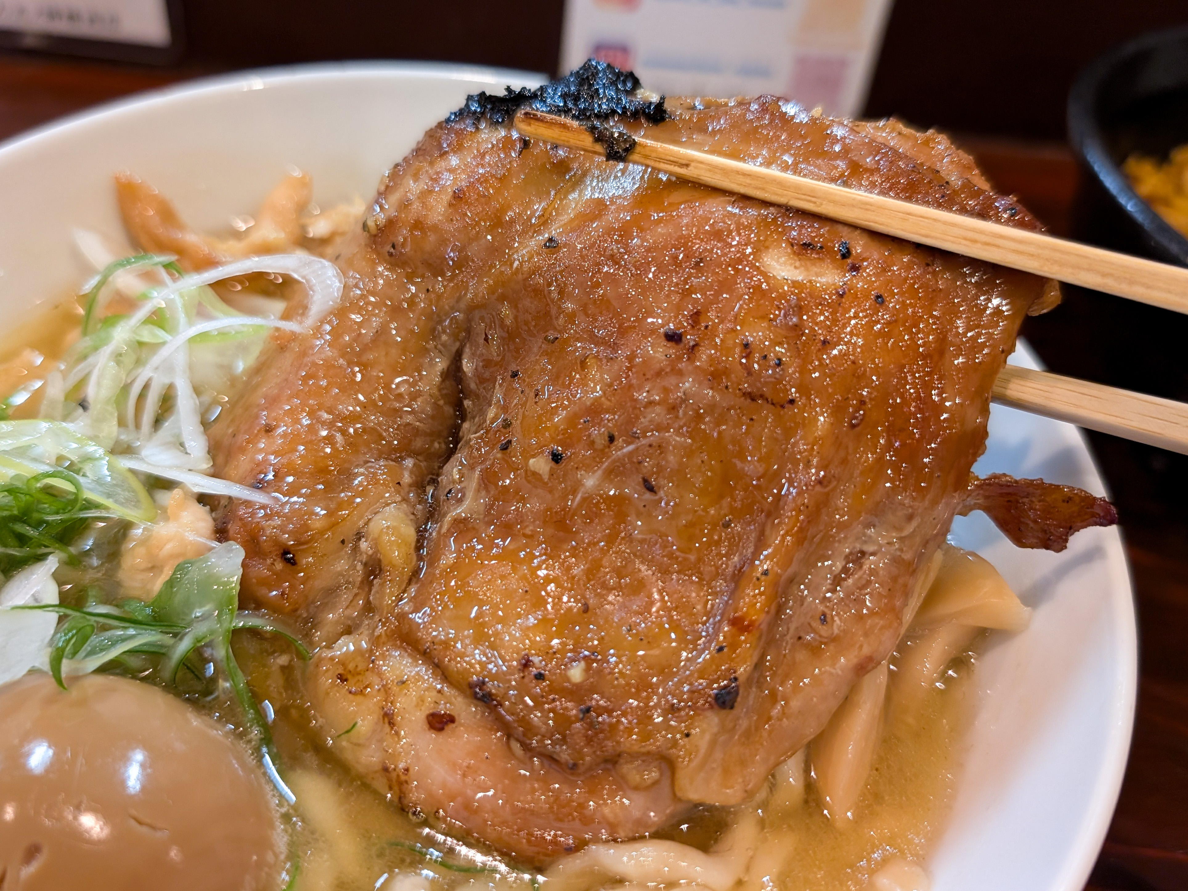 こちらが今月の限定「炭焼きチキンの痛風鶏白湯」。肉の日の割には大人しめのビジュアルだろうか。今のところ、痛風っぽさも特に感じない。