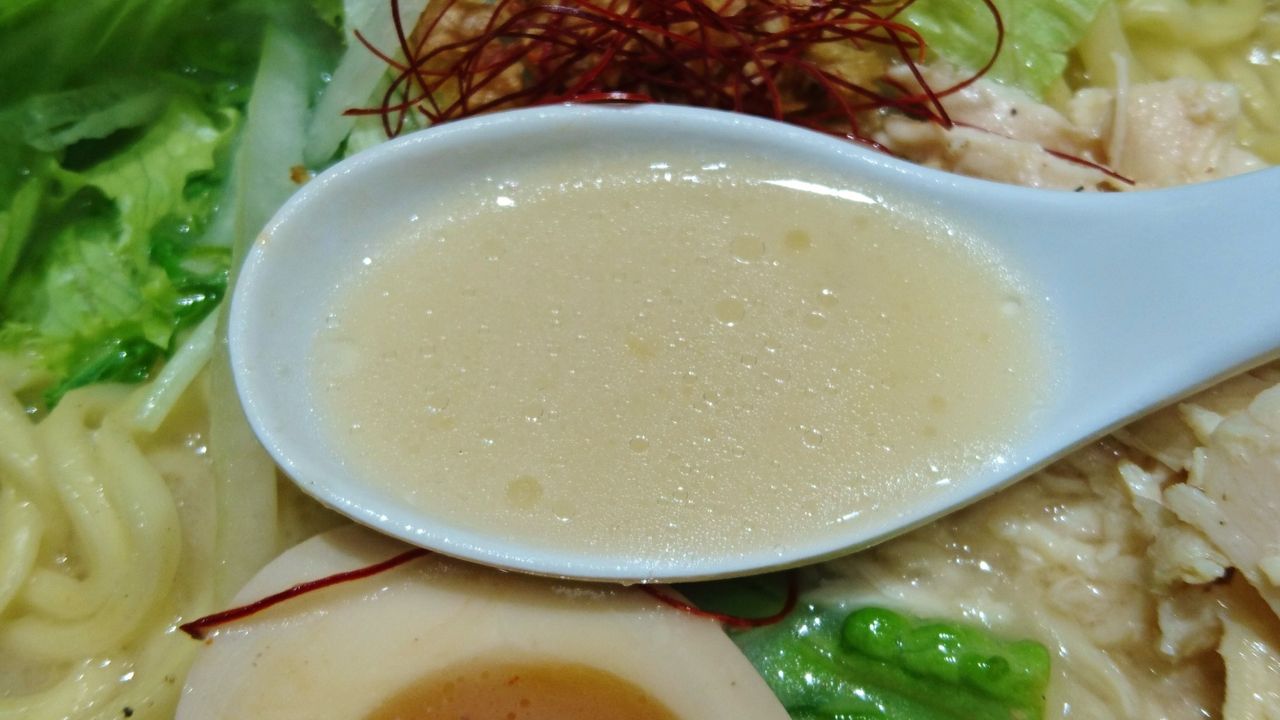 トッピングは、鶏のほぐし身・レタス・紫の草(トレビス?)・フライドオニオン・柚子皮・味玉・糸唐辛子など。
