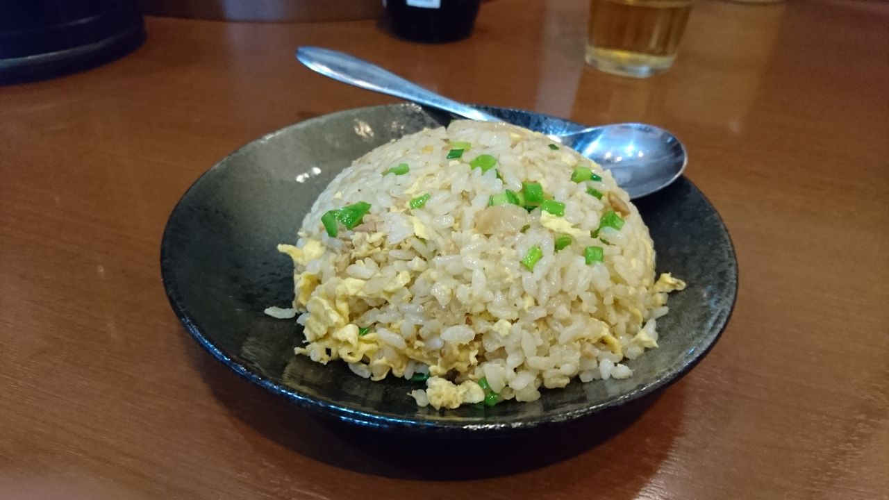 半炒飯は、卵・ネギ・チャーシューと至ってシンプル(というかやや寂しい)な具材で、薄めの味付け。パラパラ仕立てで、ご飯も水分が抜け過ぎず硬くなっていなかった。半と言っても侮れない炒飯で、どうせなら全炒飯にすればよかったと後悔したね。