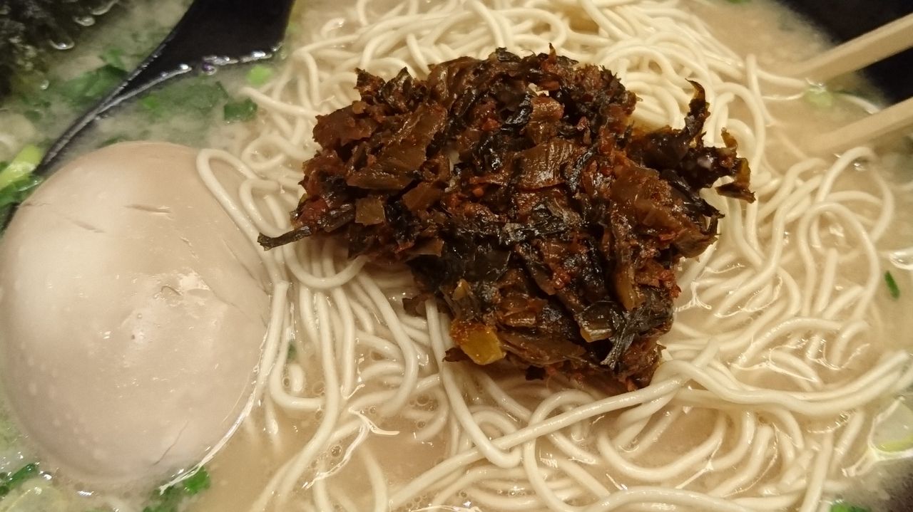 そこに先に持ってきた激辛高菜を投入。こいつがマジ辛いので、写真くらい入れただけでも豚骨スープの味が、辛さにもっていかれてしまうから要注意。