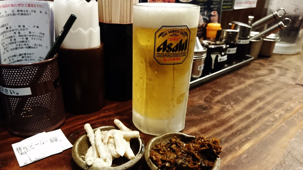 アテを出されるわけではないが、薬味のセルフコーナーがあるので「マカロニサラダ」と「激辛高菜」を取ってきてツンツングビグビ。