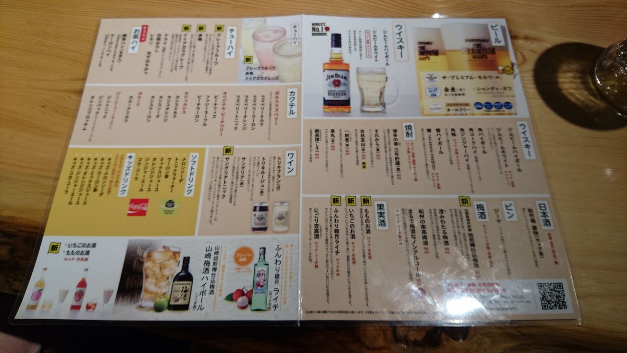 フードメニューは串もの7割とその他3割といったところしょうか。ラーメンも2品あります。ドリンクもそこそこ充実していて、子連れ大歓迎的な、「キッズドリンク」なんてメニューもありました。