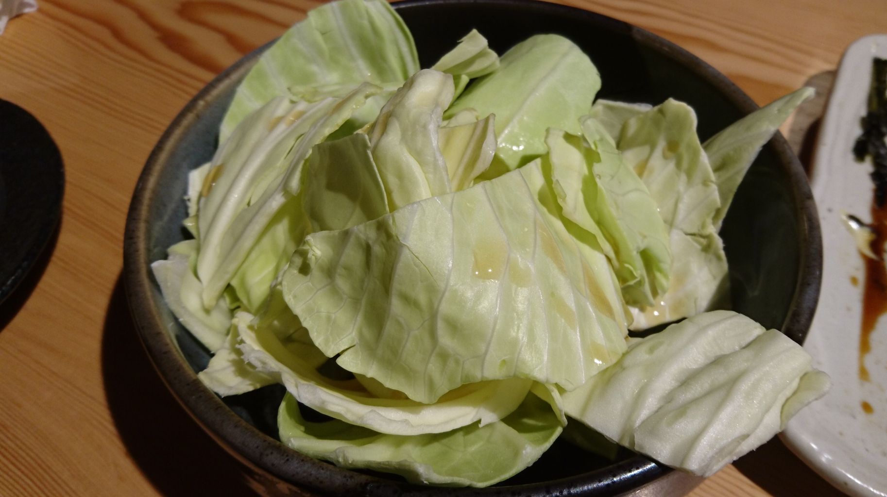 塩系のドレッシングがかかっています。次の配膳待ちに、ポリポリムシャムシャつつくのに丁度良い。だけどおかわり自由といわれても、そう食えるもんじゃありませんよ。