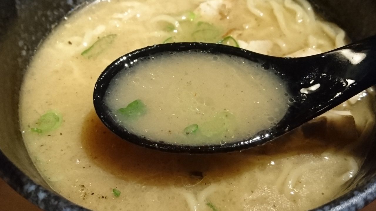 口当りは濃厚系のポッテリしたトロミがあるんだけど、このトロミが嘘っぽい。失礼な表現をしちゃえば、美味しいカップ麺にありがちなスープ。