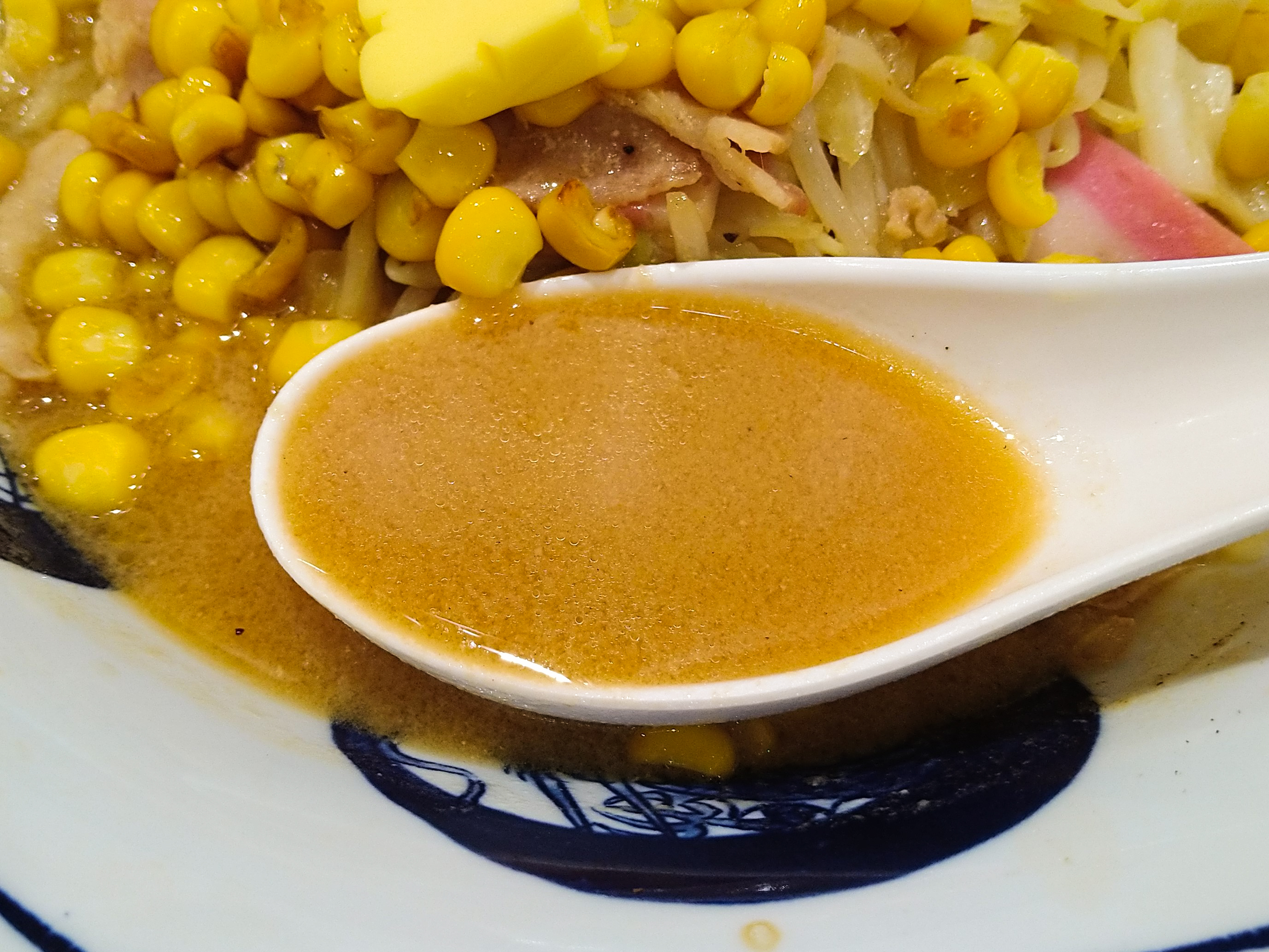 いきなり問題発覚。コーンが麺に全然絡んでこねぇ。他の野菜を媒介にすれば何粒かは箸で持ち上げることも可能だが、大抵の粒は落下してしまい結局レンゲで食べることを余儀なくされる。さらにはバターが小っっっちゃ。@60円だからこのサイズが妥当なのかもしれないが、しっかりバター感を得たいなら3~4個は入れないとダメかと。