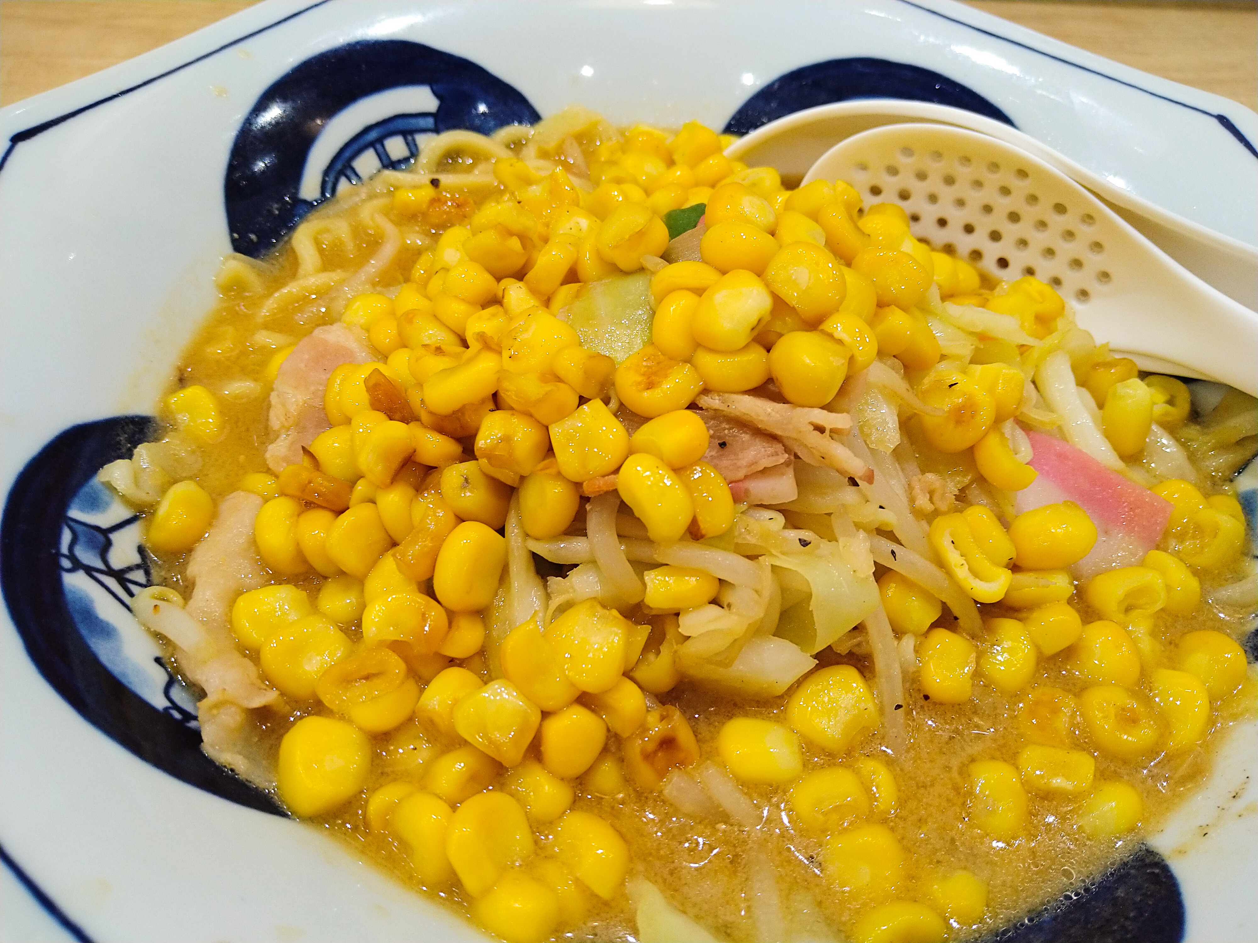 トッピングは、コーン・野菜とか・海老とか・カマボコとか。なにやら北海道のスイートコーンが100g乗っているらしいけど、その下では普通にちゃんぽんしていました。