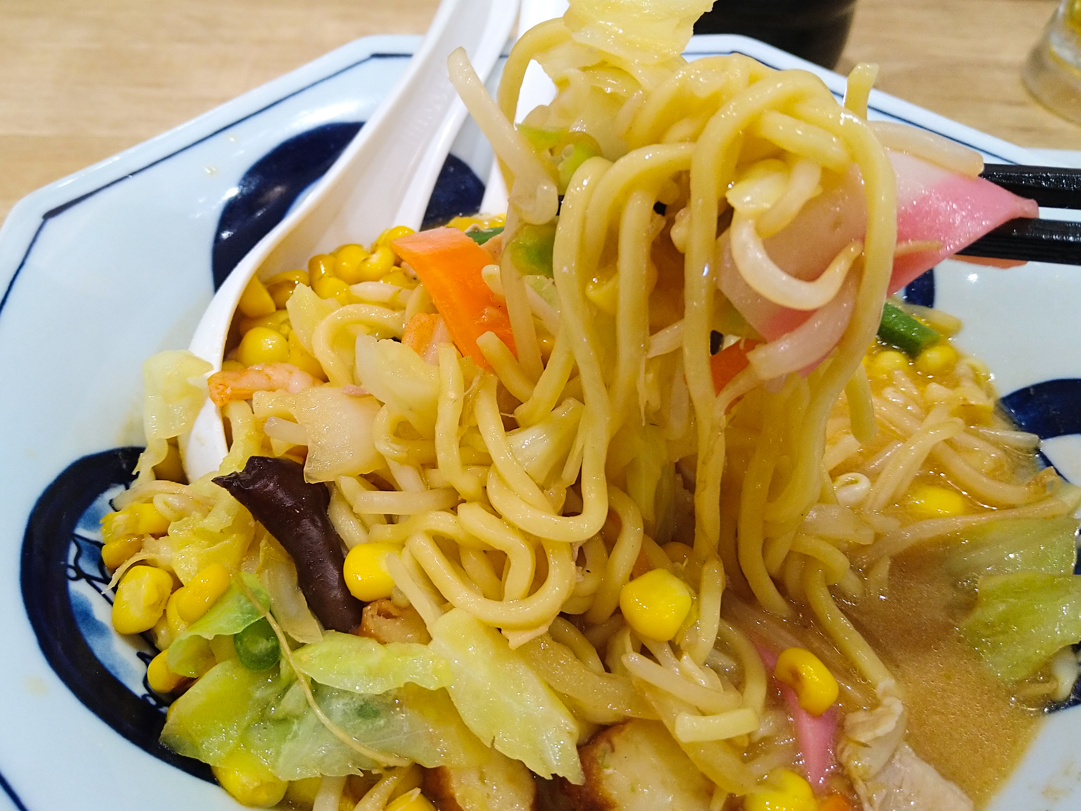 んん…、なんだろ? 優しい味というか、あんま味しねぇーというか。遠くにちゃんぽん的な野菜+海鮮の出汁感はあるものの、味噌の雰囲気で全体的にぼやけてしまった感じがする。