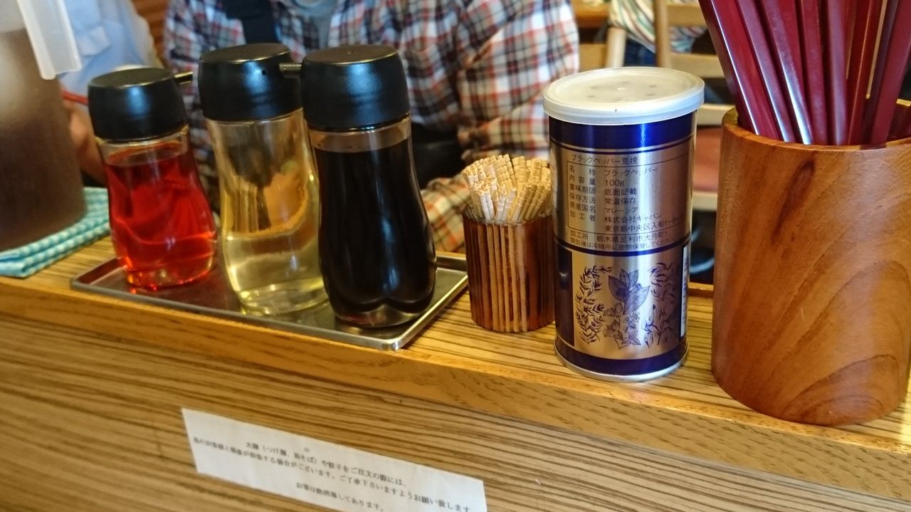 調味料はご覧の通りフードコート一括設置のようで、胡椒・七味・タバスコ・粉チーズ・酢・醤油・ソースがスタンバイ。ちなみに七味とつま楊枝が、テレコになっていました。(テレコ伝わります?)