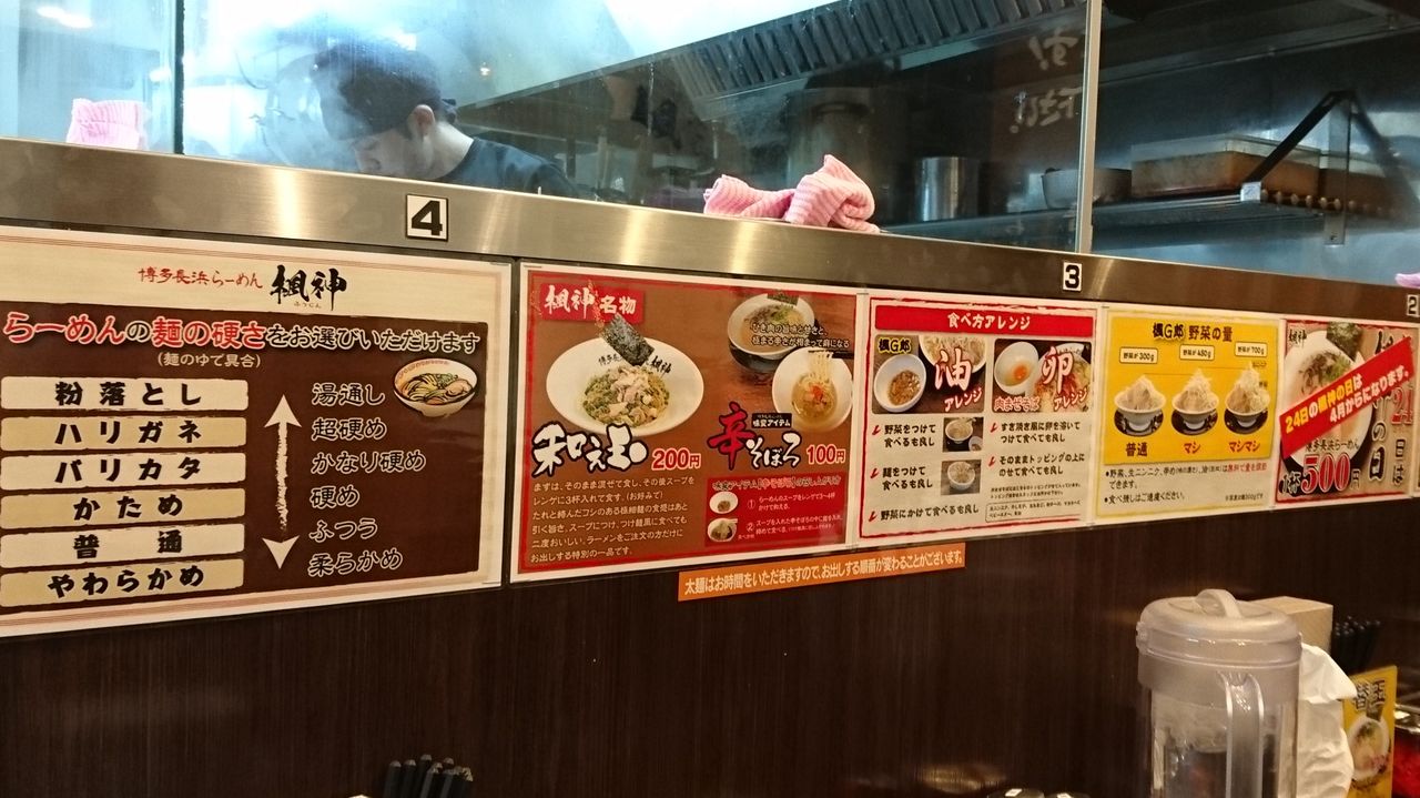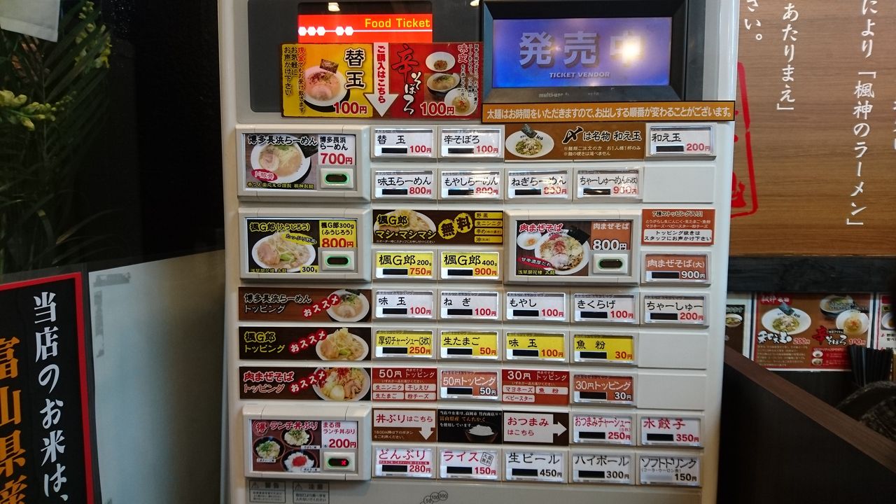 麺類は3種で、基本の「博多長浜ラーメン」・二郎系の「楓G郎」・限定?の「肉まぜそば」。 それと、各種トッピング・酒類・飯類。