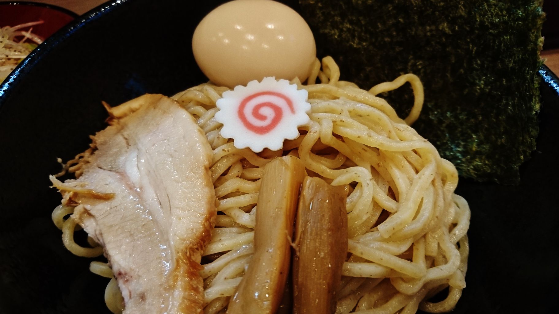 トッピングは、麺丼にメンマ・ナルト・チャーシュー・味玉、つけ汁の中に刻みタマネギ。