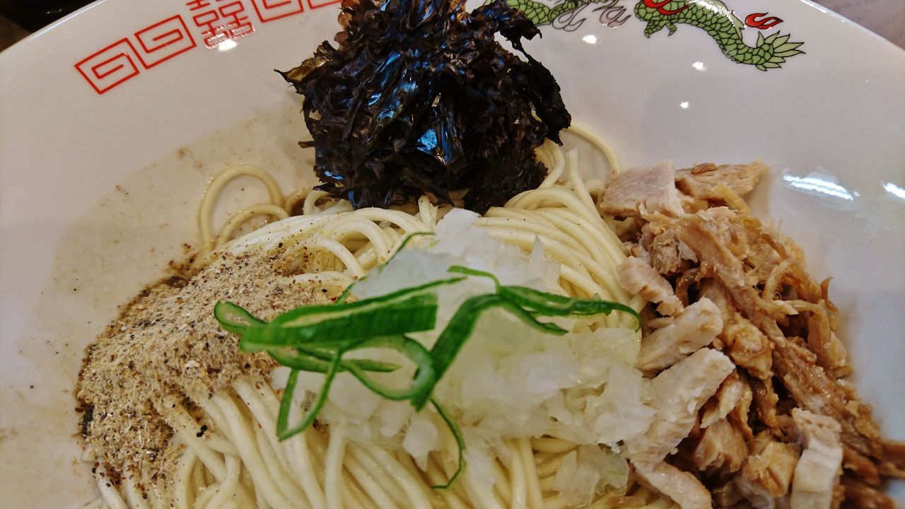 白髪ネギの上に黒く見える粉は、煮干し粉かな?黒胡椒かな?気付かなかったくらいだからあんま味に影響はないんだな💦