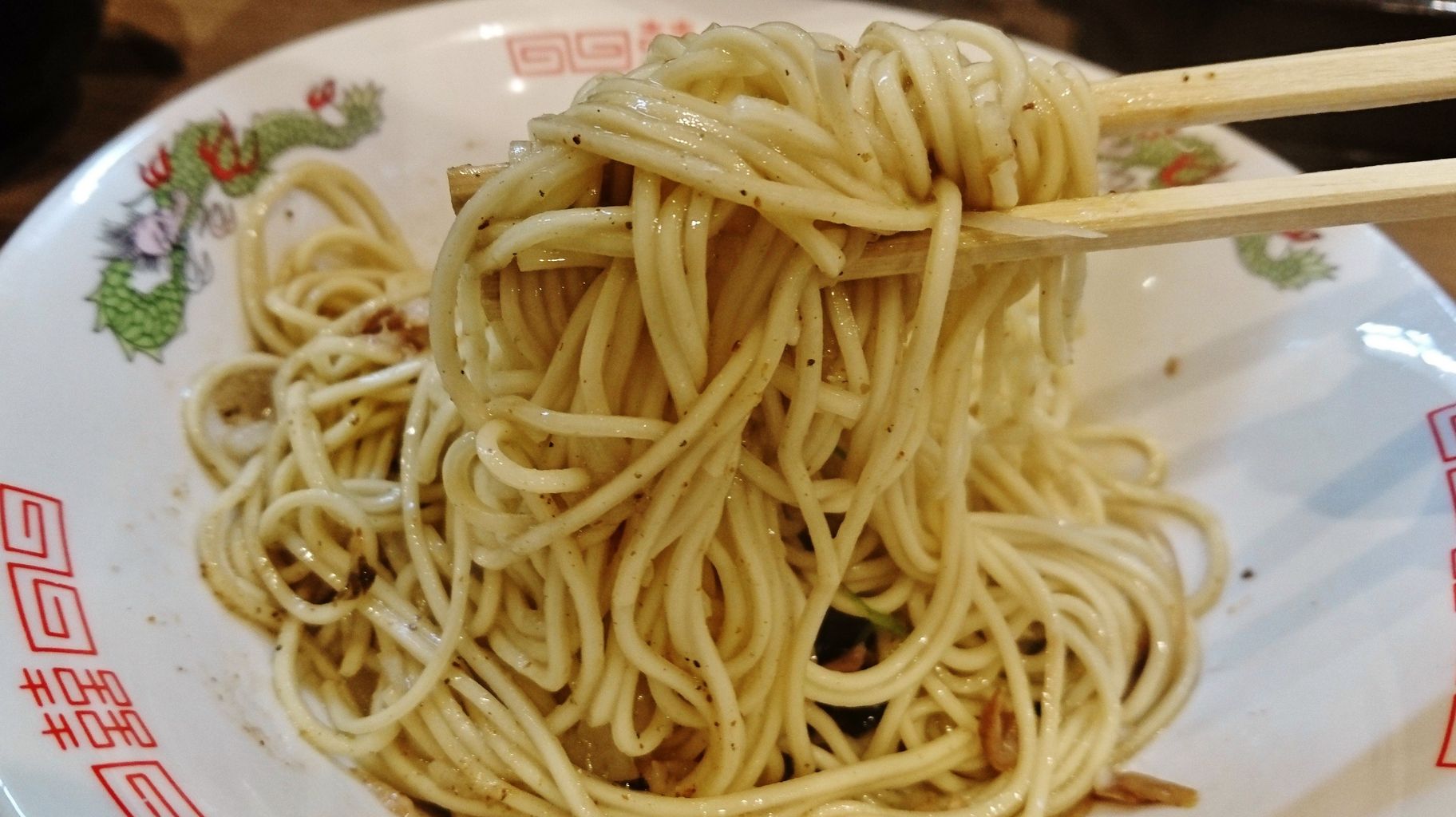 油そばのようにガッツリ混ぜてそのまま啜ると、おいおいこっちの方がビターで美味いじゃないの!この細ストレートもプリッと張りがあって悪くないし!