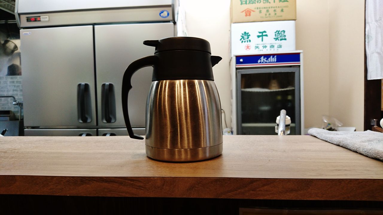 スープ割りは、熱々のあっさり煮干しスープがポットに入って、カウンター上にスタンバイされています。