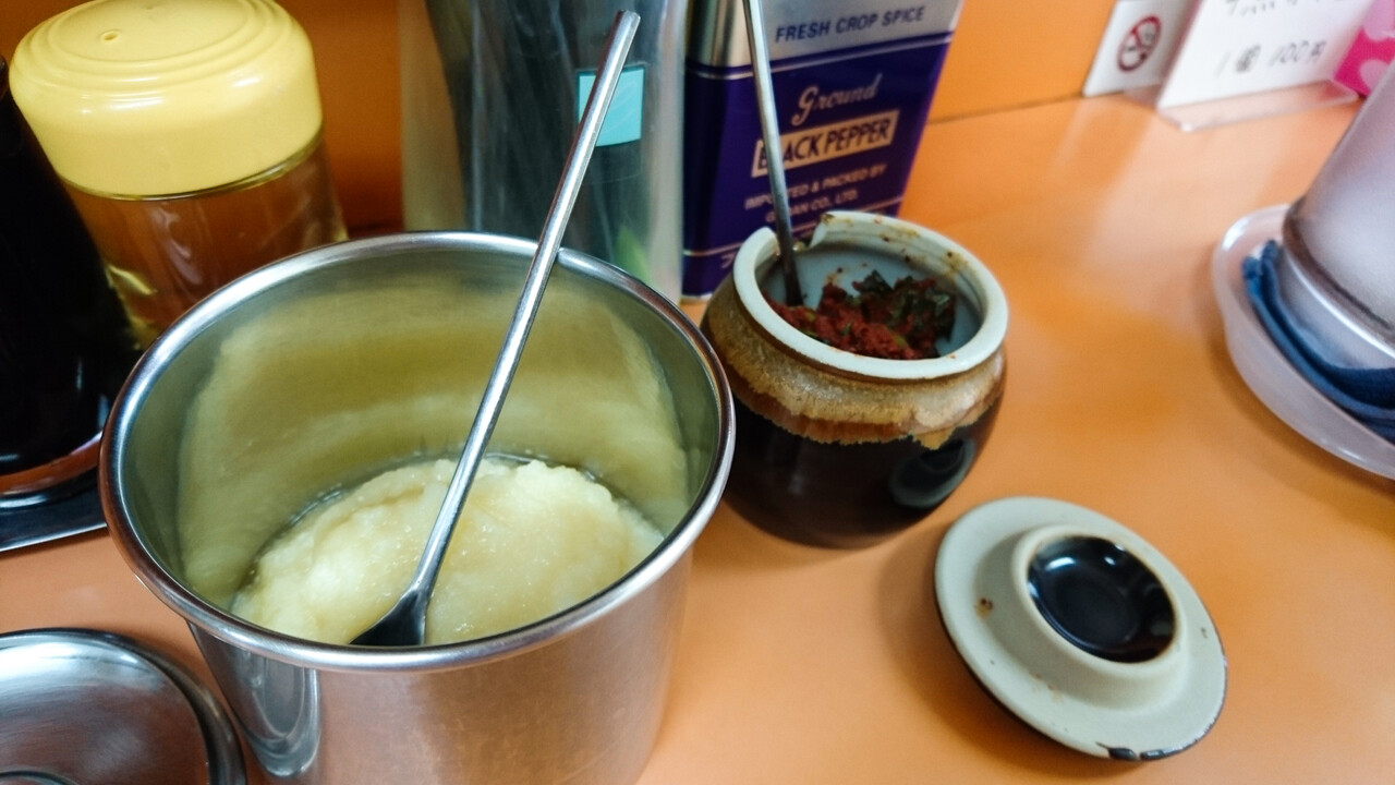 卓上調味料は、醤油・酢・ラー油・胡椒・ニンニク・ニラ&唐辛子がスタンバイ。