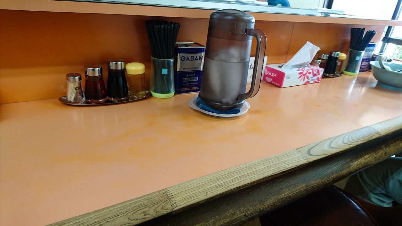 カウンター12席くらい。カウンター板奥行45cm、椅子非固定、席間普通。後客が右隣に来ましたが、肘が触れそうな圧迫感はありません。ただし、お冷のピッチャーの上部がカウンター上段にぶつかるので、奥に入らなくチト邪魔かな。いや、邪魔です。