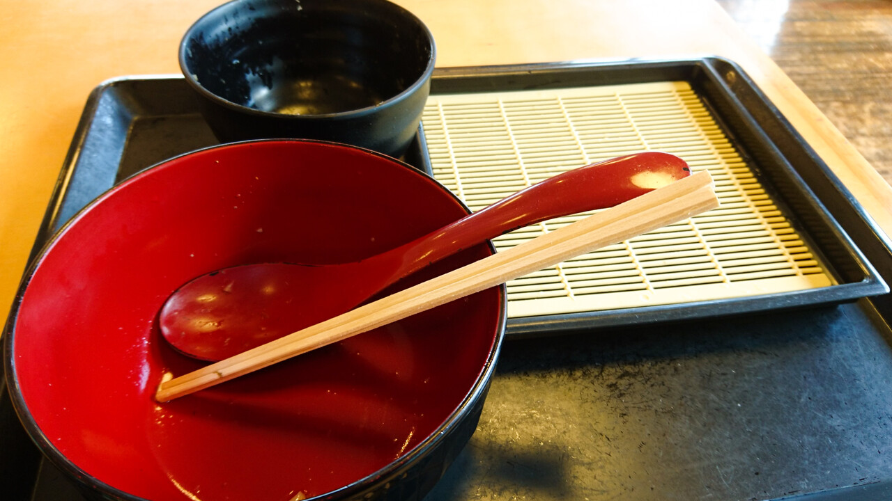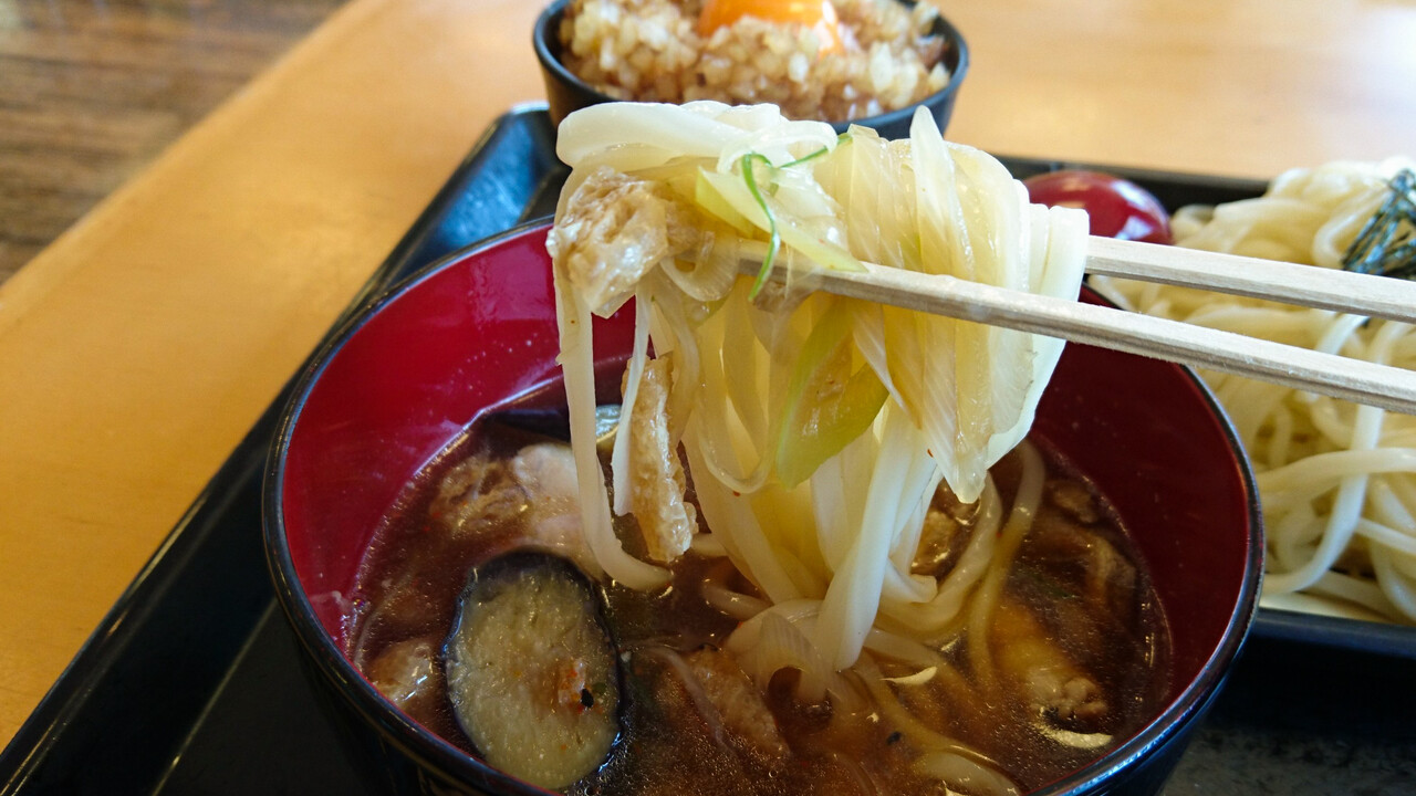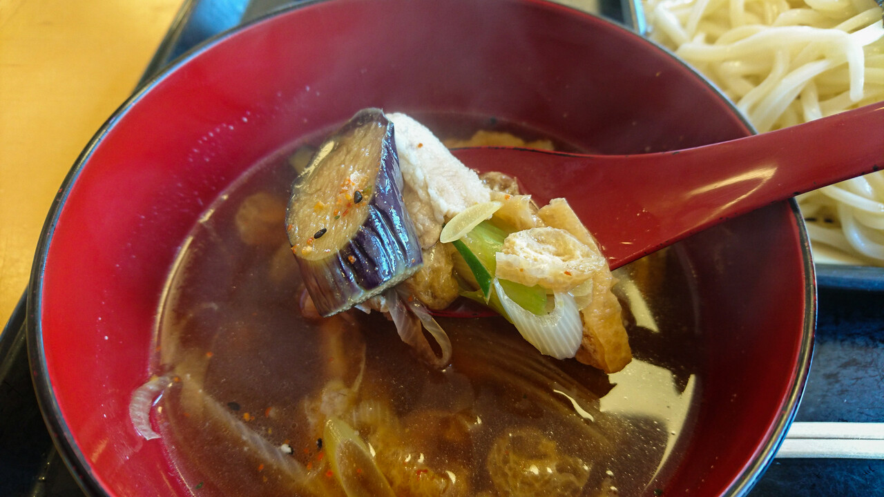 つけ汁の中には、ナス・ネギ・豚肉・油揚げが入っています。具沢山って感じでもないけど、ショボい感じでもない。全ての食材が地産なのでしょうか?そのそもナスもネギも、旬ではないけど。