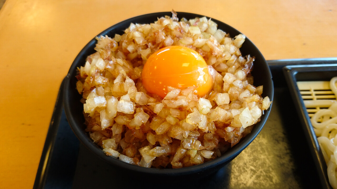 うどんとは逆に、特筆すべきはこの玉葱ライス!細かく微塵切りにした玉葱を麺つゆか出汁醤油的なものに浅浸け(和えただけかも)し鰹節と混ぜたものが、これでもかってくらいたっぷり乗せられています。ホントにこれでもかってくらいネ!