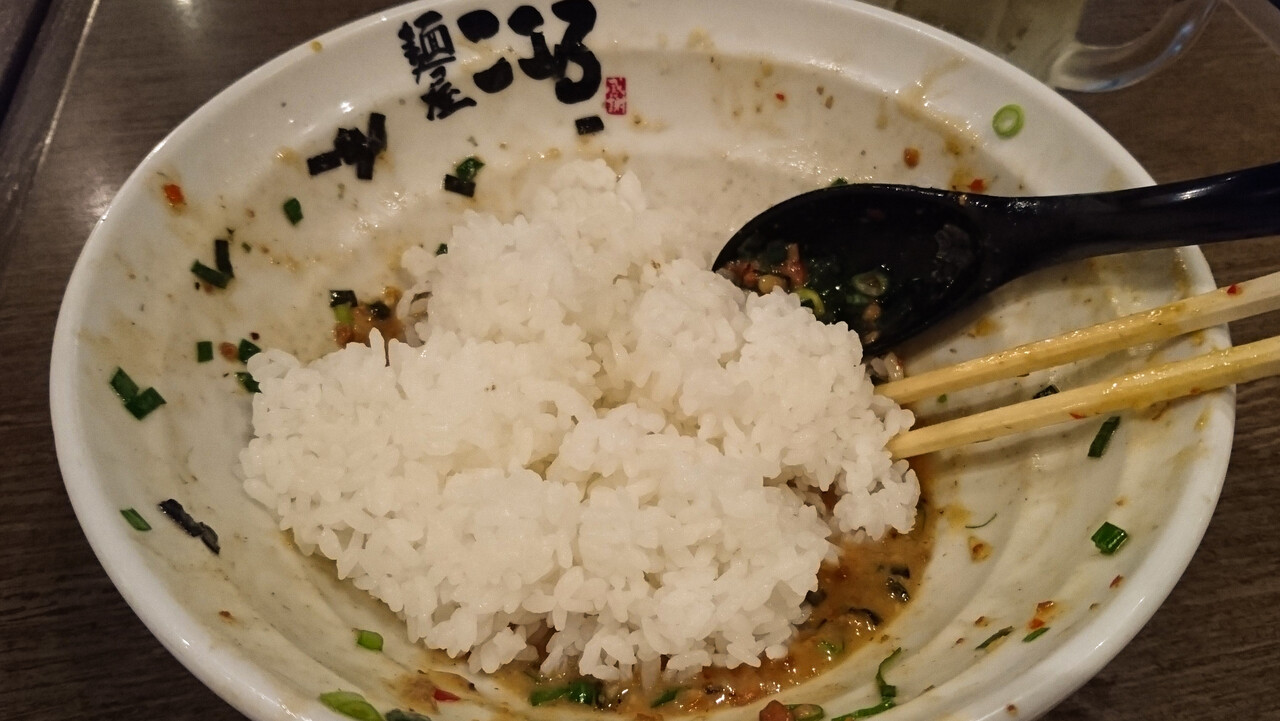 麺の食べ方次第で残るタレの量が変わってくると思うが、どのくらいライスを入れれば良いのだろうか全く分からん?とりあえずお茶碗1杯分(しゃもじで軽くポン×3)くらい。